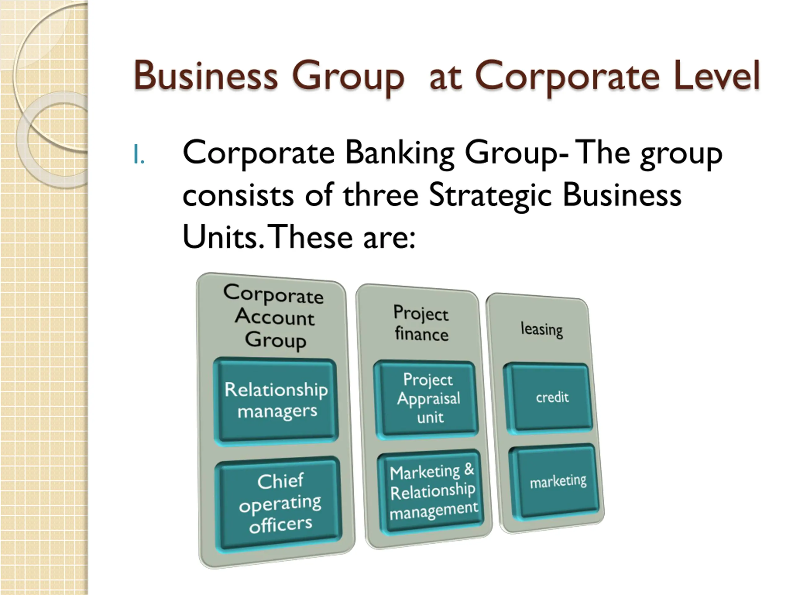 Business Group at Corporate Level Corporate Banking Group-The group consists of three Strategic Business Units. These are: I.