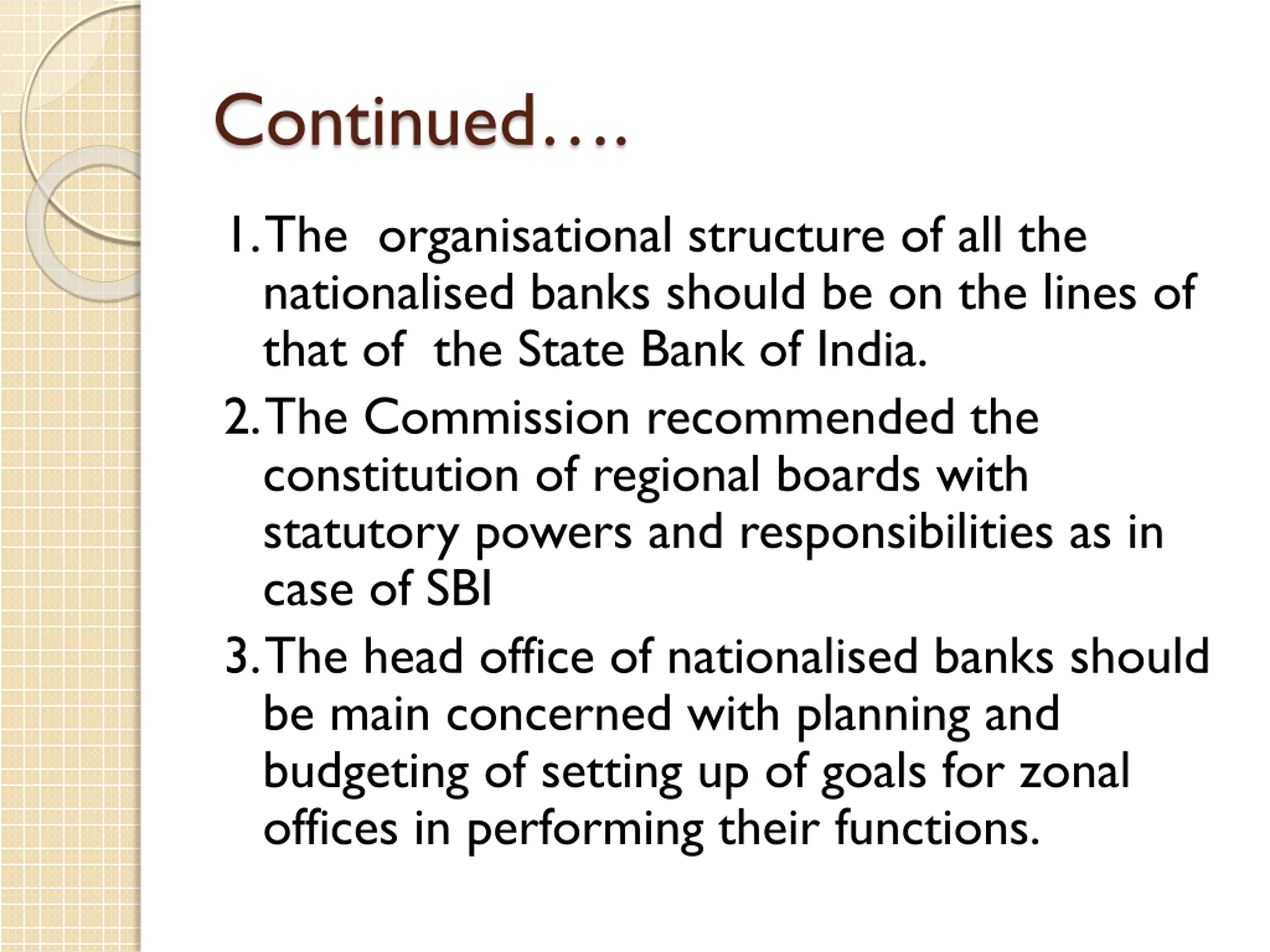 Continued. 1. The organisational structure of all the nationalised banks should be on the lines of that of the State Bank of India. 2. The Commission recommended the constitution of regional boards with statutory powers and responsibilities as in case of SBI 3. The head office of nationalised banks should be main concerned with planning and budgeting of setting up of goals for zonal offices in performing their functions.