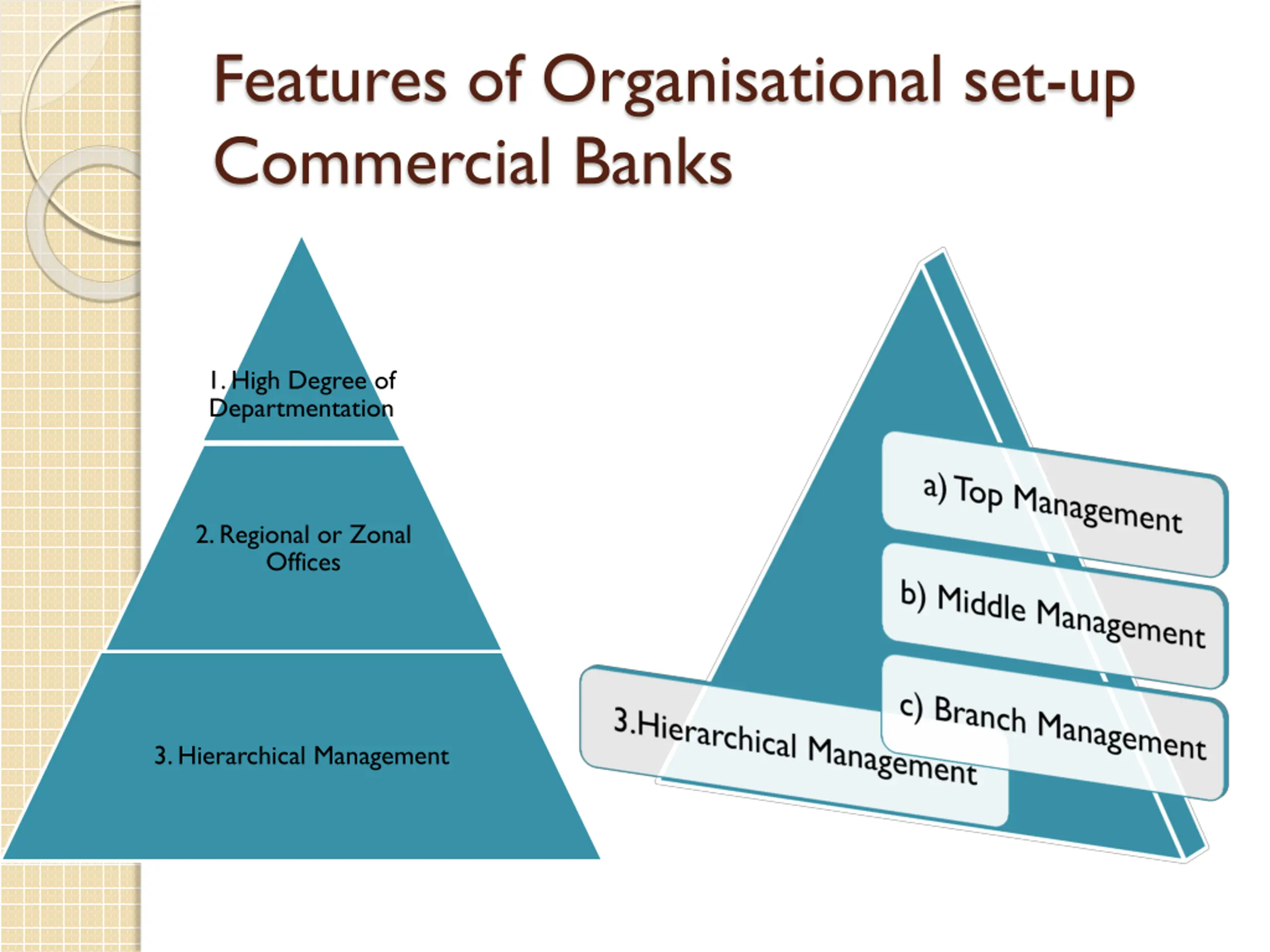 Features of Organisational set-up Commercial Banks 1. High Degree of Departmentation 2. Regional or Zonal Offices 3. Hierarchical Management