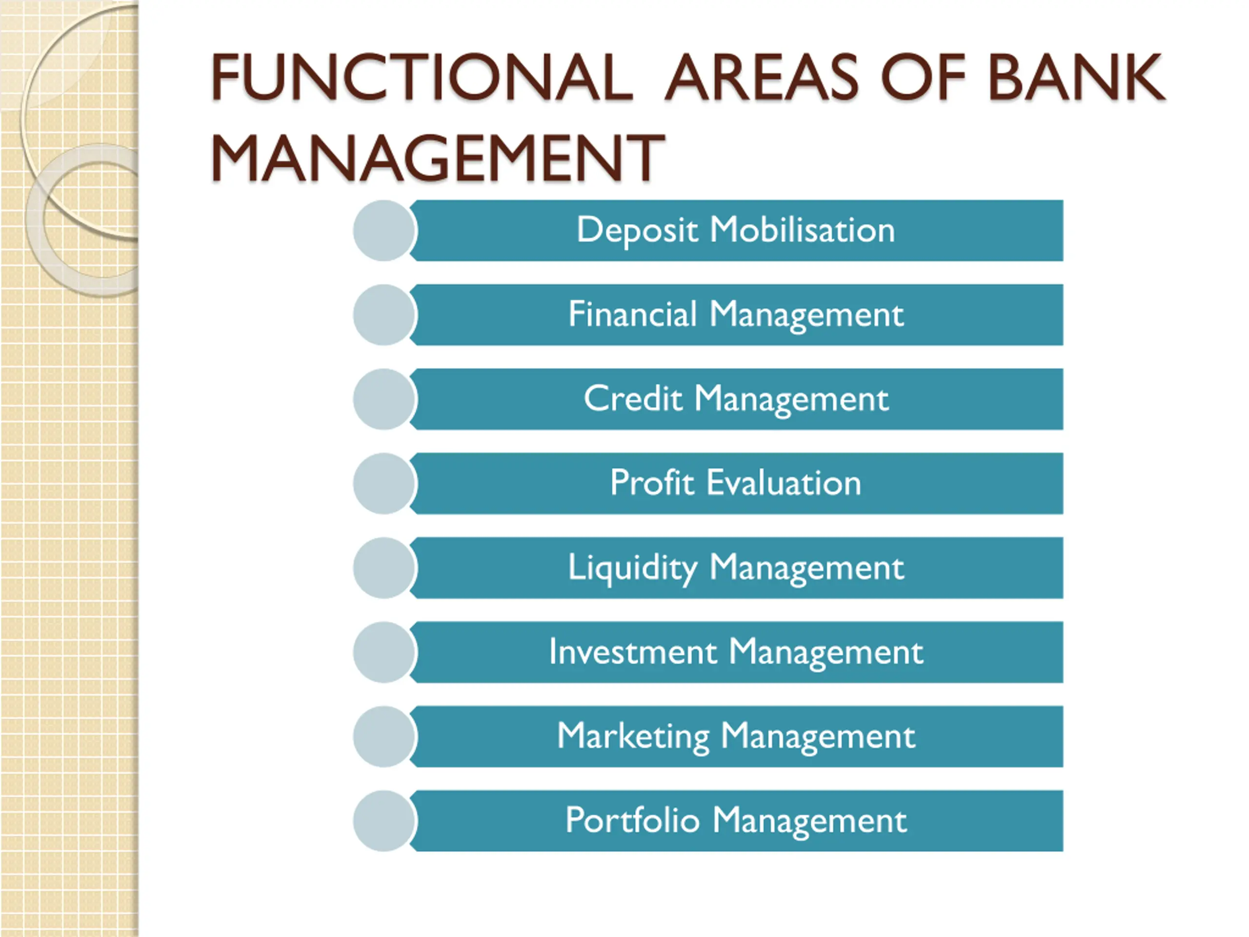 FUNCTIONAL AREAS OF BANK MANAGEMENT Deposit Mobilisation Financial Management Credit Management Profit Evaluation Liquidity Management Investment Management Marketing Management Portfolio Management