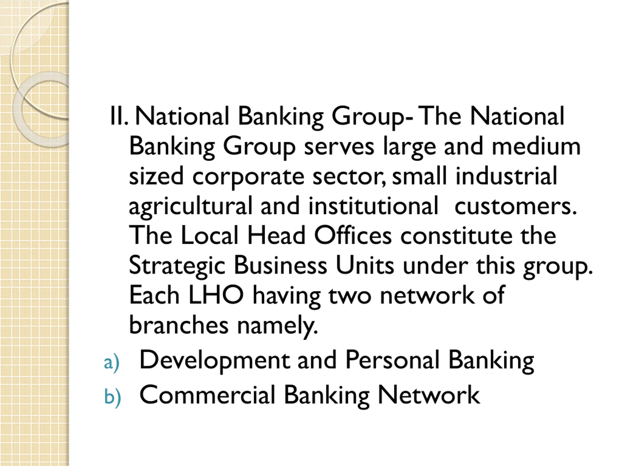 II. National Banking Group-The National Banking Group serves large and medium sized corporate sector, small industrial agricultural and institutional customers. The Local Head Offices constitute the Strategic Business Units under this group. Each LHO having two network of branches namely. a) Development and Personal Banking b) Commercial Banking Network