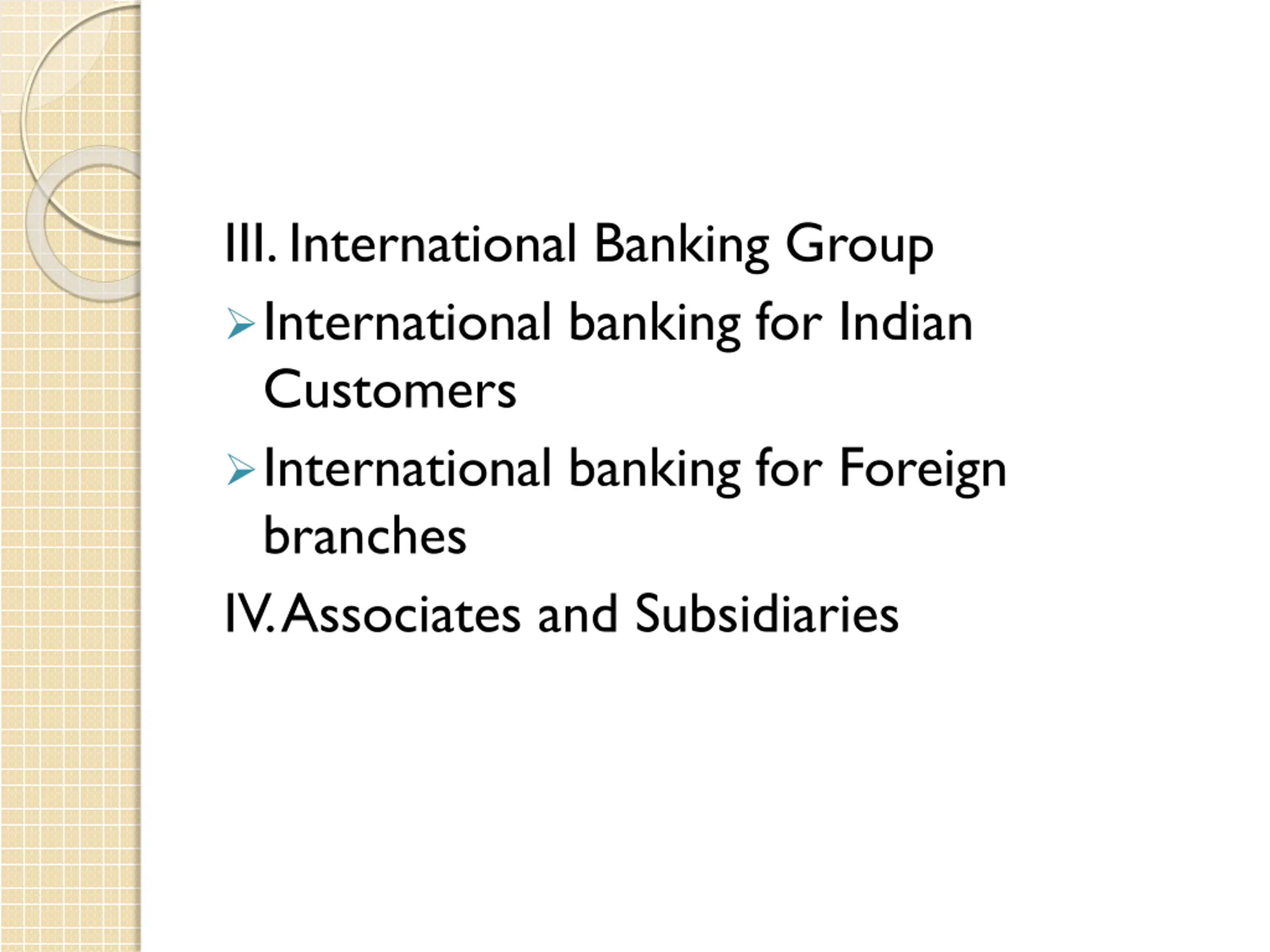 III. International Banking Group International banking for Indian Customers International banking for Foreign branches IV. Associates and Subsidiaries