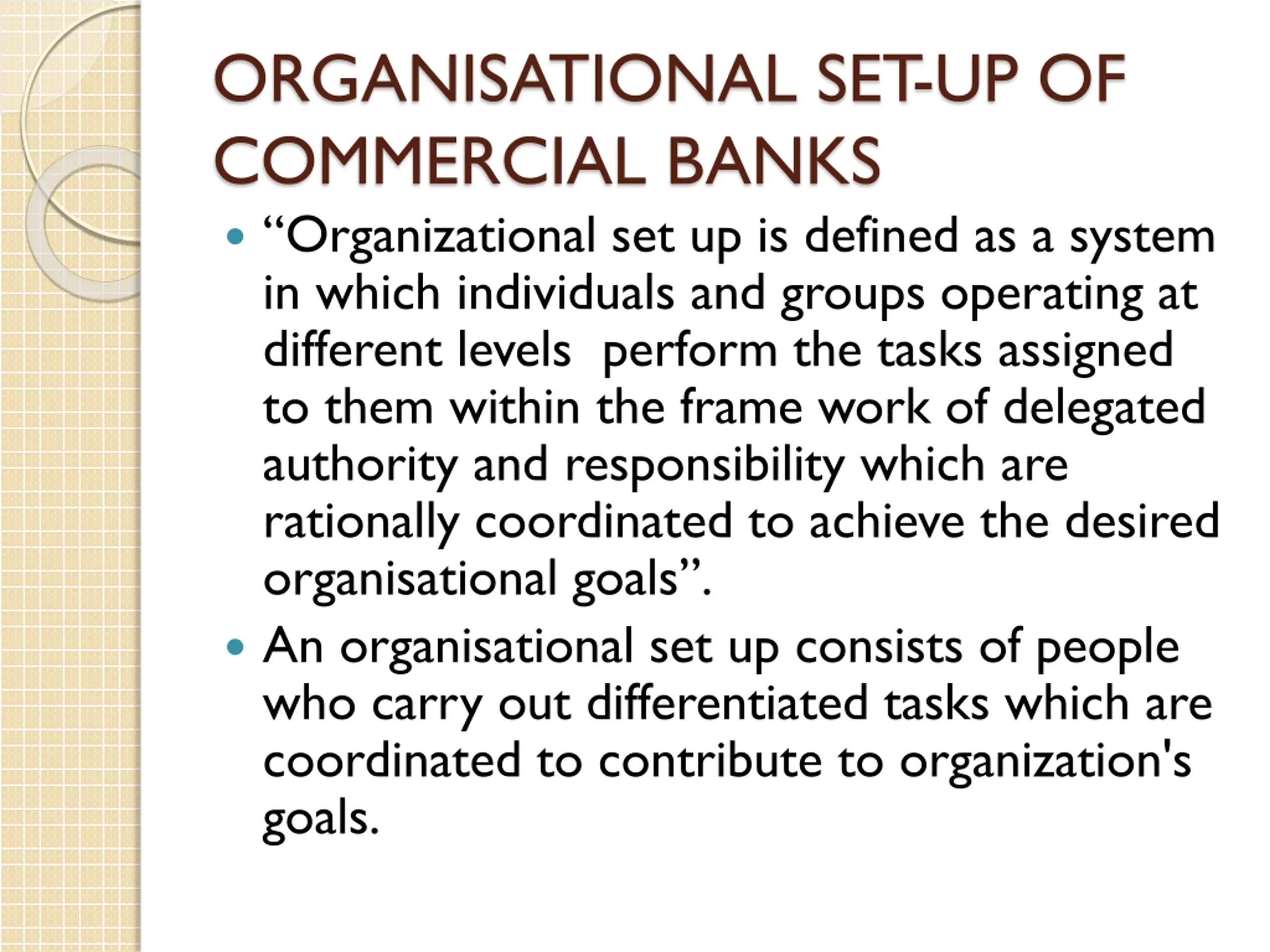 ORGANISATIONAL SET-UP OF COMMERCIAL BANKS Organizational set up is defined as a system in which individuals and groups operating at different levels perform the tasks assigned to them within the frame work of delegated authority and responsibility which are rationally coordinated to achieve the desired organisational goals . An organisational set up consists of people who carry out differentiated tasks which are coordinated to contribute to organization's goals.