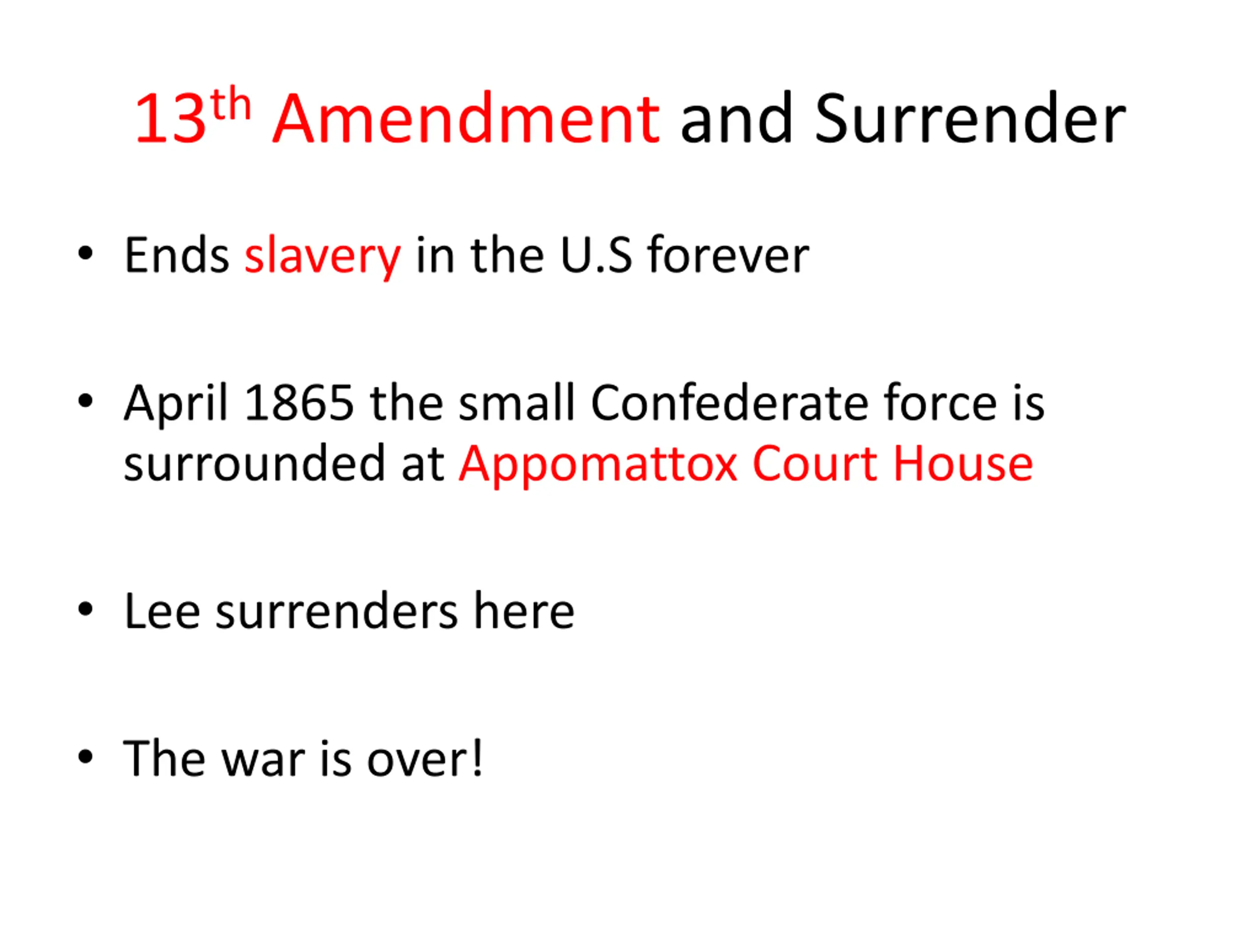 13thAmendment and Surrender Ends slavery in the U.S forever April 1865 the small Confederate force is surrounded at Appomattox Court House Lee surrenders here The war is over!