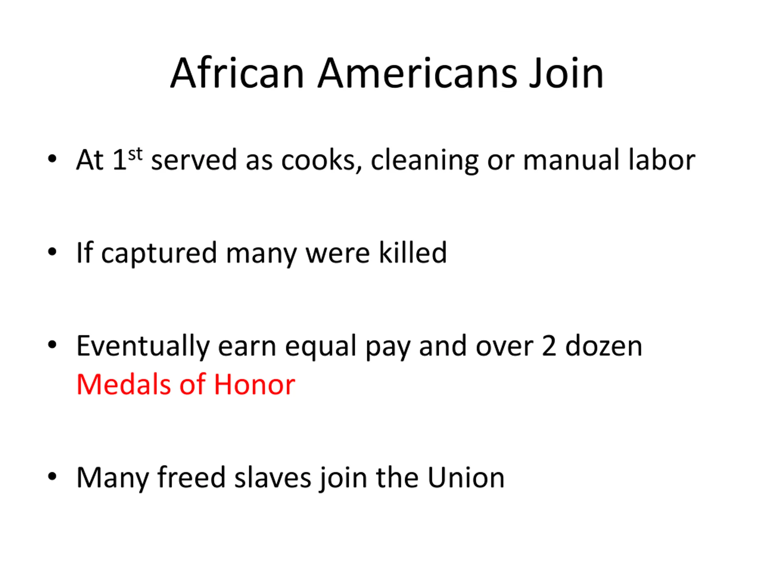 African Americans Join At 1stserved as cooks, cleaning or manual labor If captured many were killed Eventually earn equal pay and over 2 dozen Medals of Honor Many freed slaves join the Union