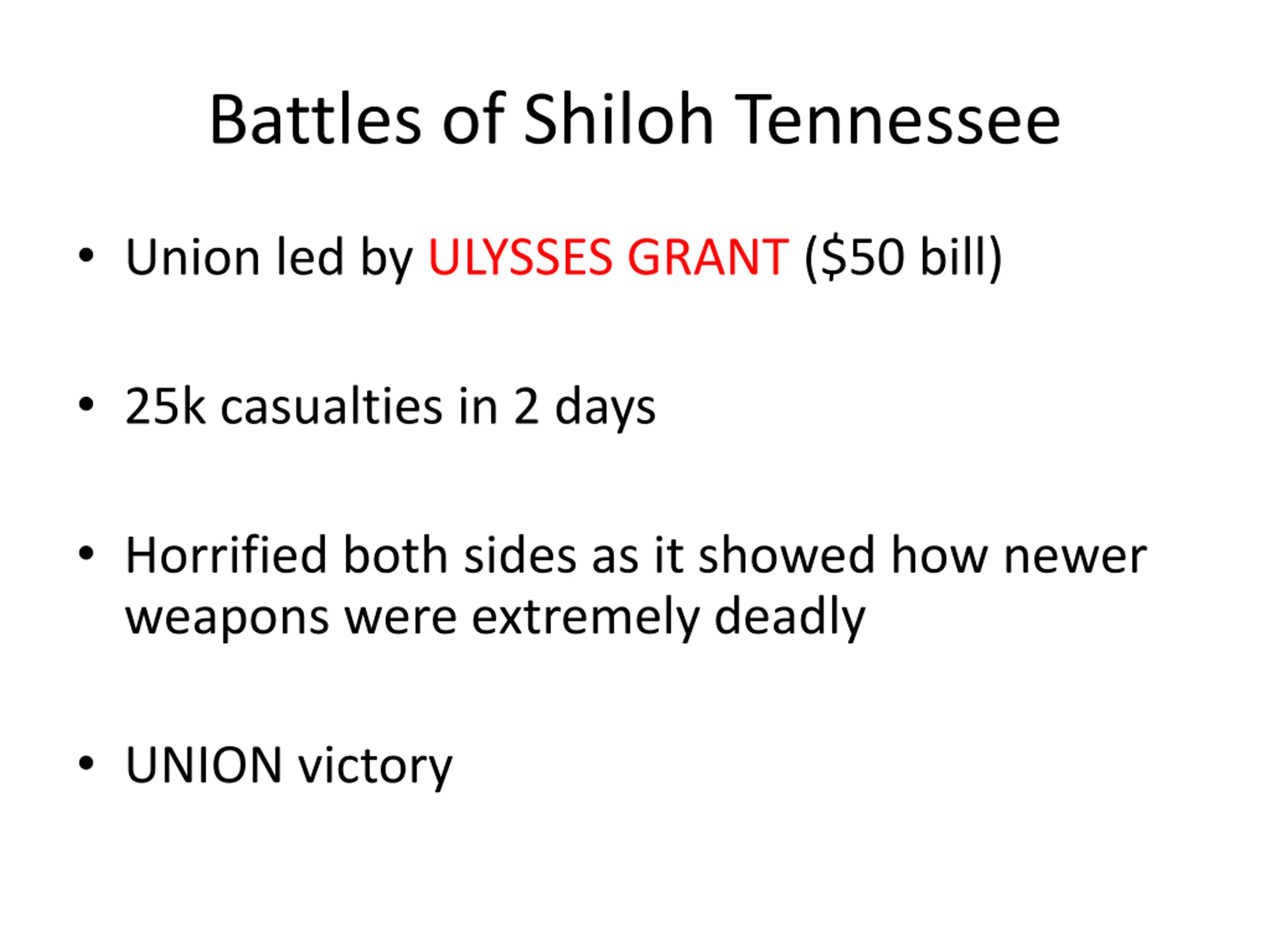 Battles of Shiloh Tennessee Union led by ULYSSES GRANT ($50 bill) 25k casualties in 2 days Horrified both sides as it showed how newer weapons were extremely deadly UNION victory