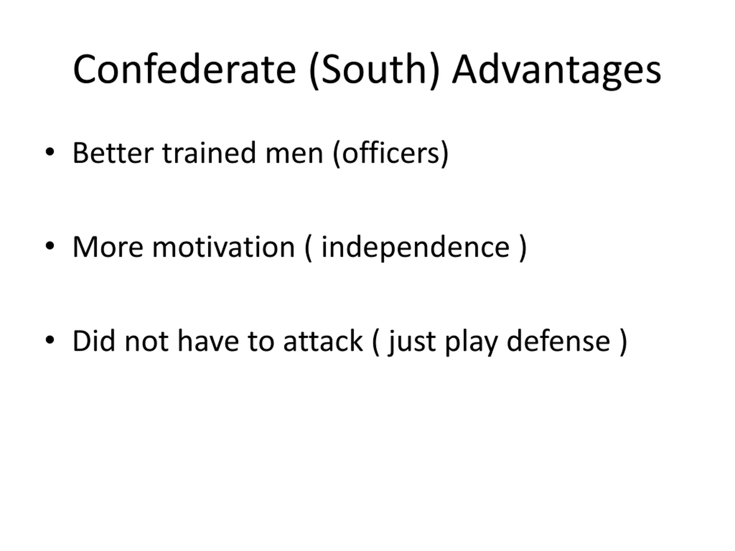 Confederate (South) Advantages Better trained men (officers) More motivation ( independence ) Did not have to attack ( just play defense )