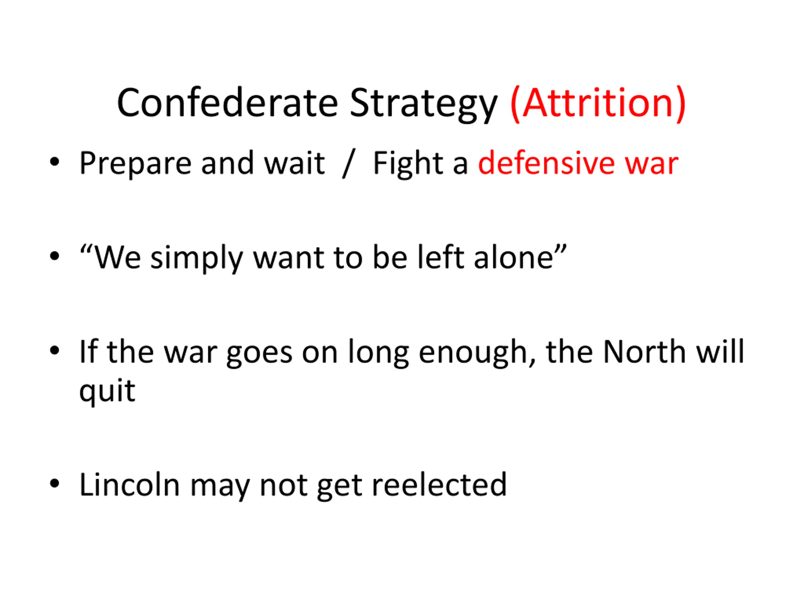 Confederate Strategy (Attrition) Prepare and wait / Fight a defensive war We simply want to be left alone If the war goes on long enough, the North will quit Lincoln may not get reelected