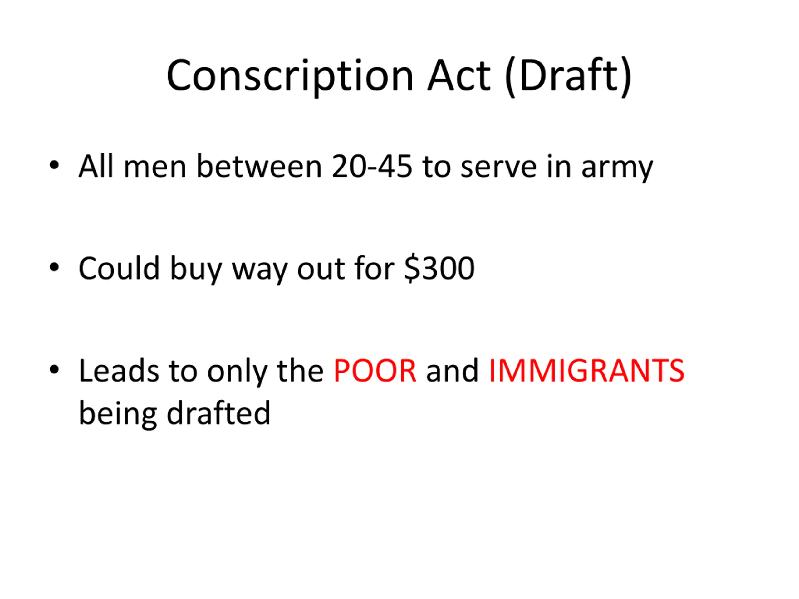Conscription Act (Draft) All men between 20-45 to serve in army Could buy way out for $300 Leads to only the POOR and IMMIGRANTS being drafted