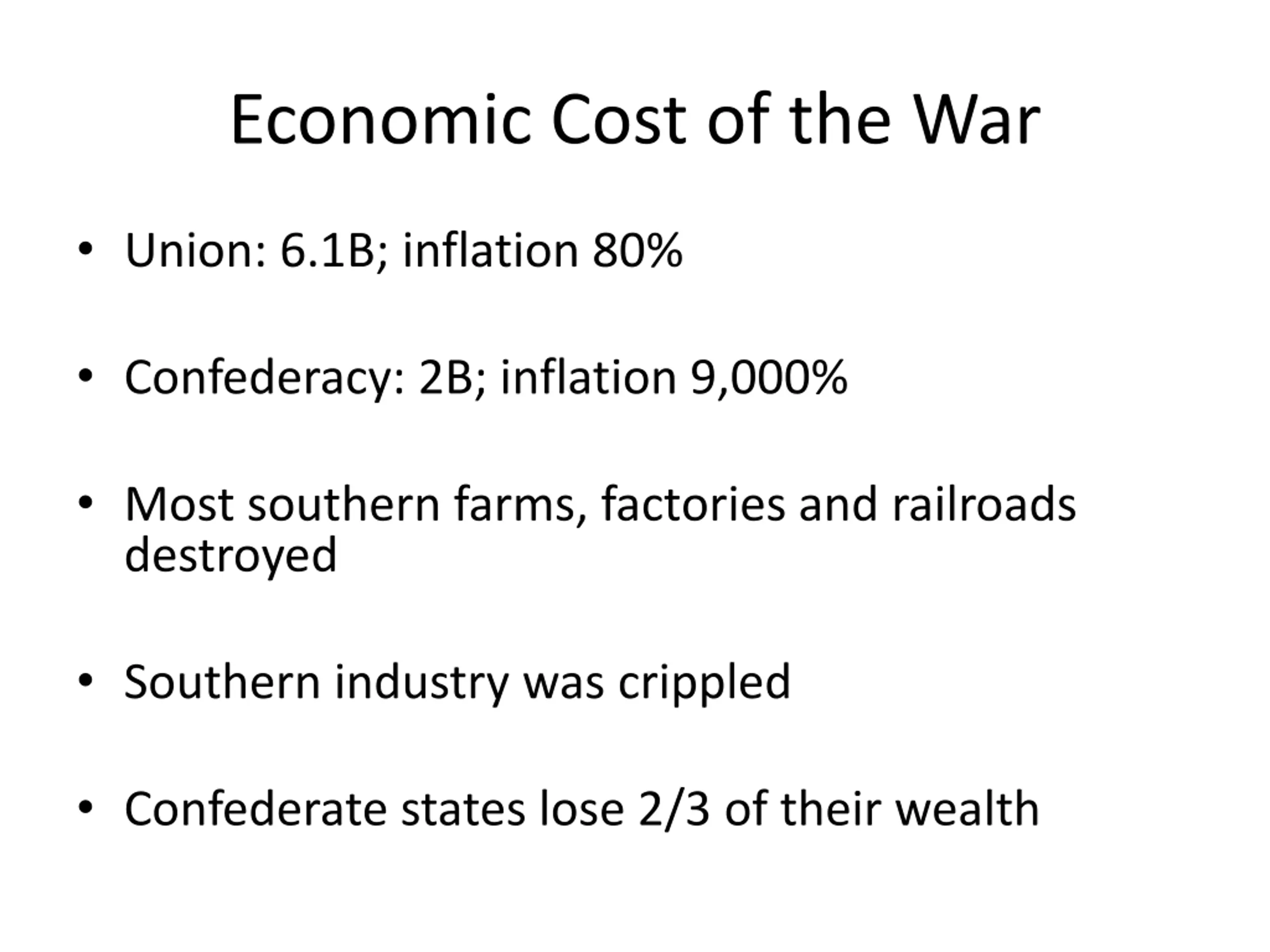 Economic Cost of the War Union: 6.1B; inflation 80% Confederacy: 2B; inflation 9,000% Most southern farms, factories and railroads destroyed Southern industry was crippled Confederate states lose 2/3 of their wealth