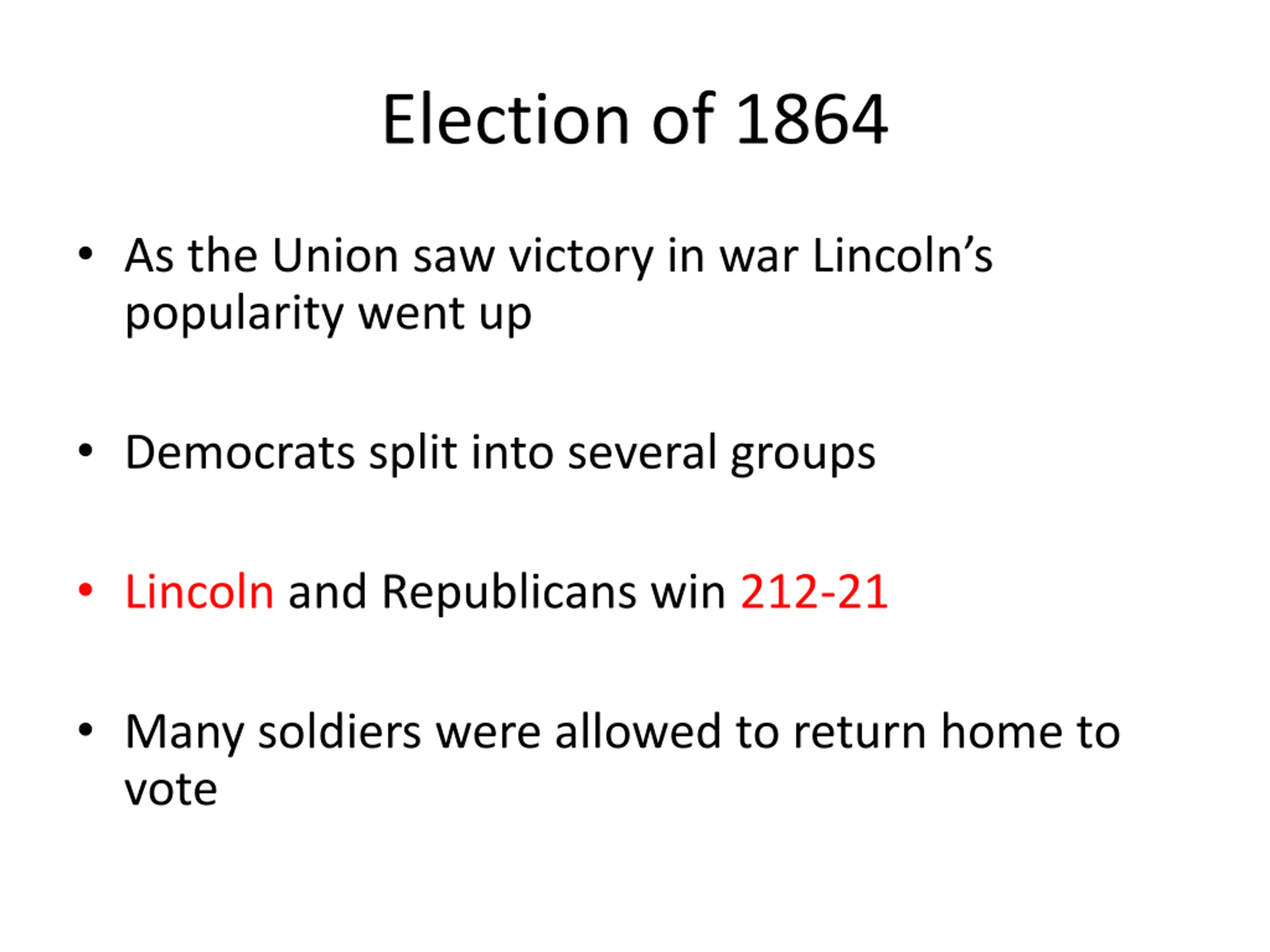 Election of 1864 As the Union saw victory in war Lincoln s popularity went up Democrats split into several groups Lincoln and Republicans win 212-21 Many soldiers were allowed to return home to vote