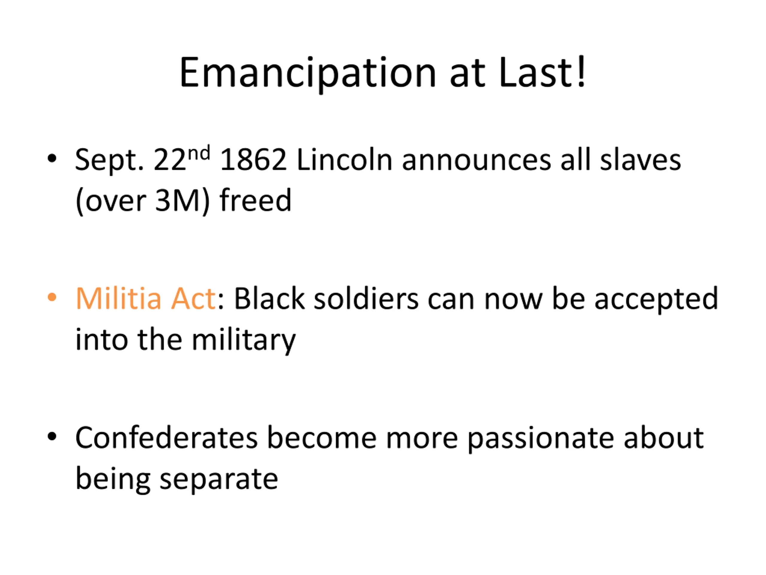 Emancipation at Last! Sept. 22nd1862 Lincoln announces all slaves (over 3M) freed Militia Act: Black soldiers can now be accepted into the military Confederates become more passionate about being separate