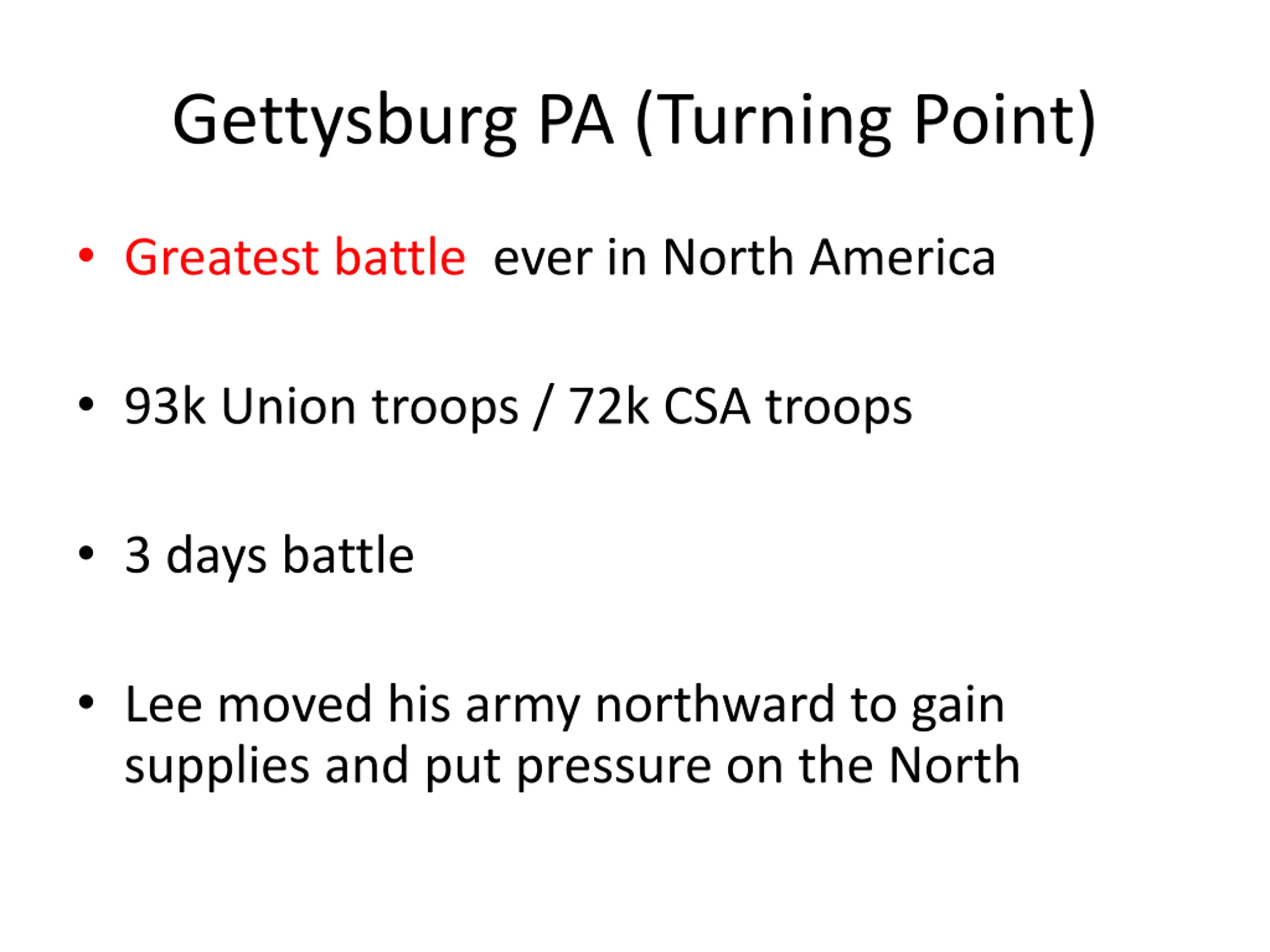Gettysburg PA (Turning Point) Greatest battle ever in North America 93k Union troops / 72k CSA troops 3 days battle Lee moved his army northward to gain supplies and put pressure on the North