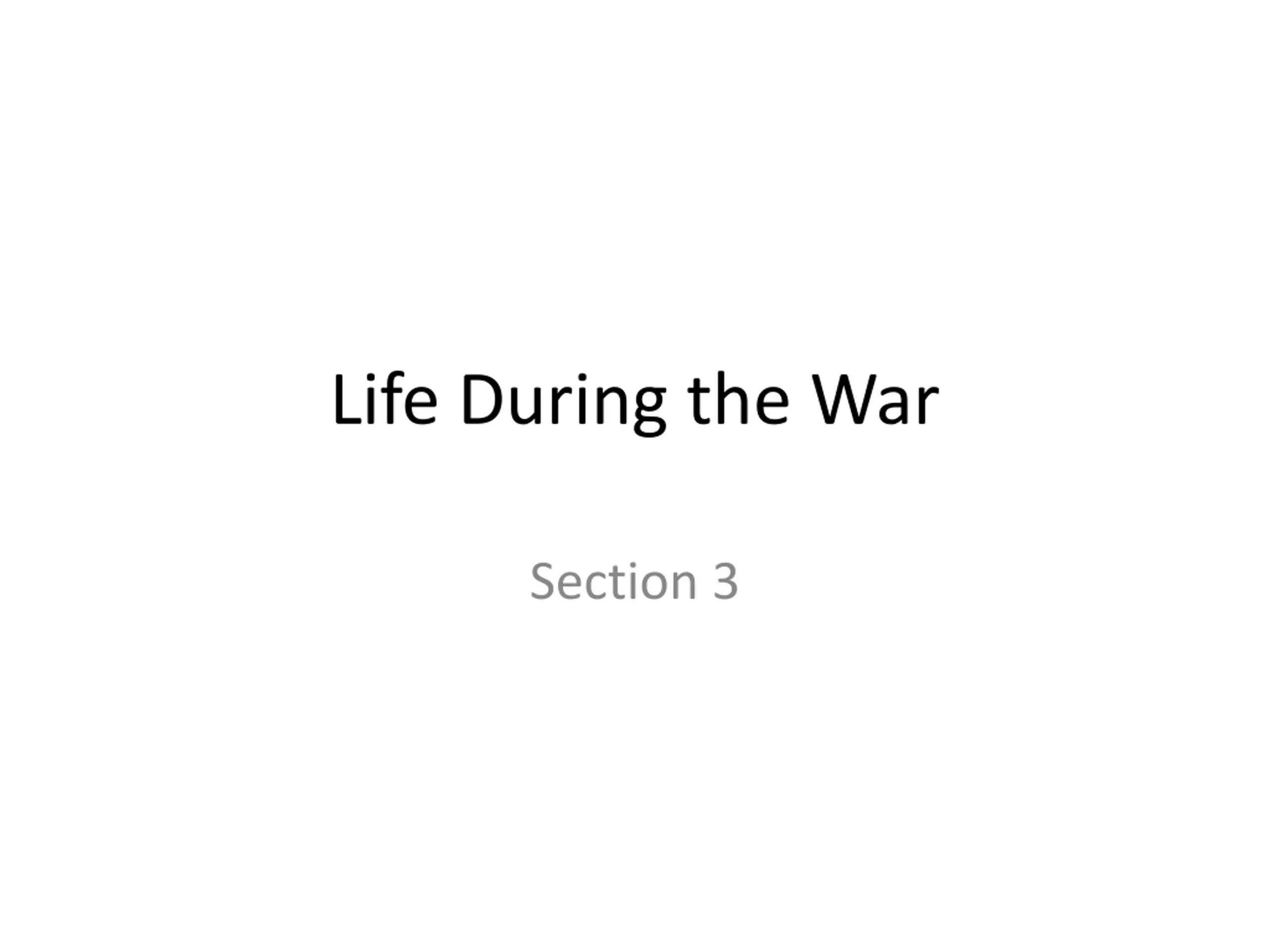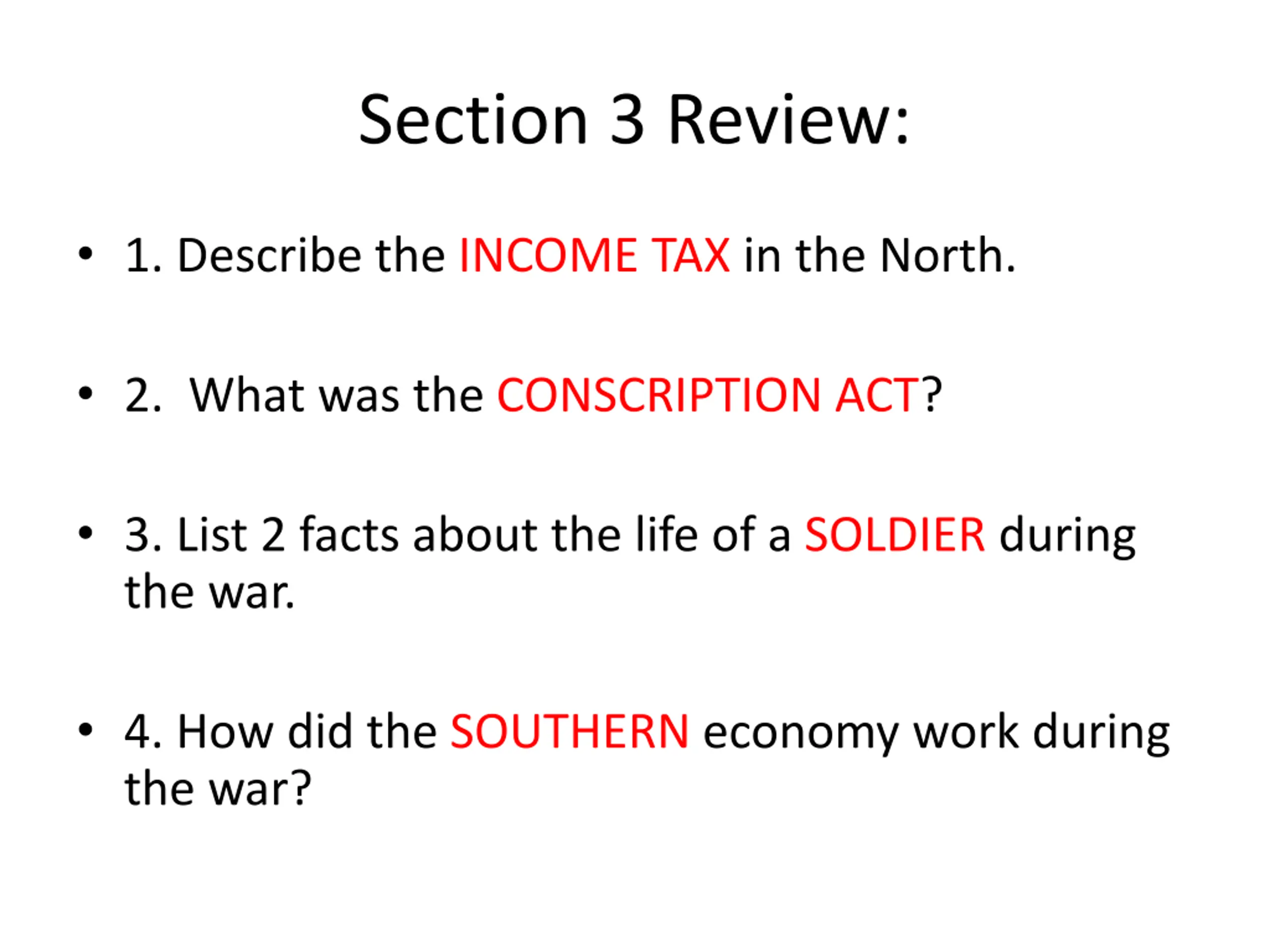 Section 3 Review: 1. Describe the INCOME TAX in the North. 2. What was the CONSCRIPTION ACT? 3. List 2 facts about the life of a SOLDIER during the war. 4. How did the SOUTHERN economy work during the war?