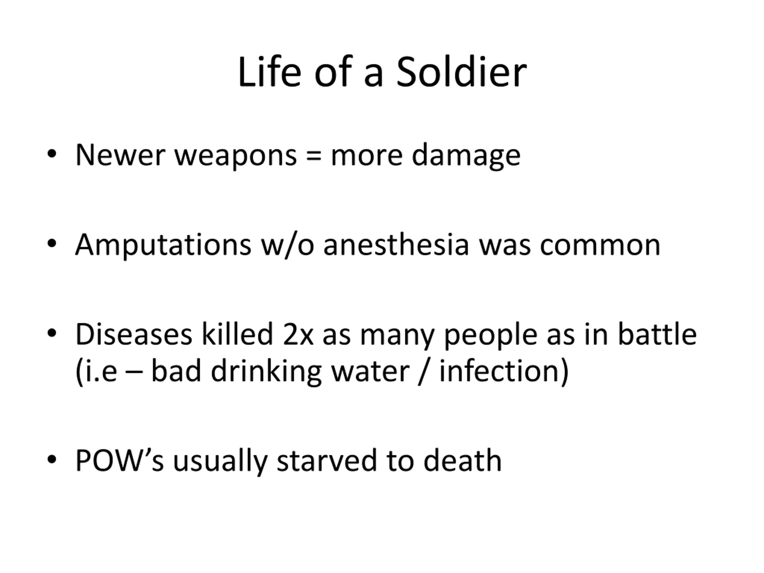 Life of a Soldier Newer weapons = more damage Amputations w/o anesthesia was common Diseases killed 2x as many people as in battle (i.e bad drinking water / infection) POW s usually starved to death