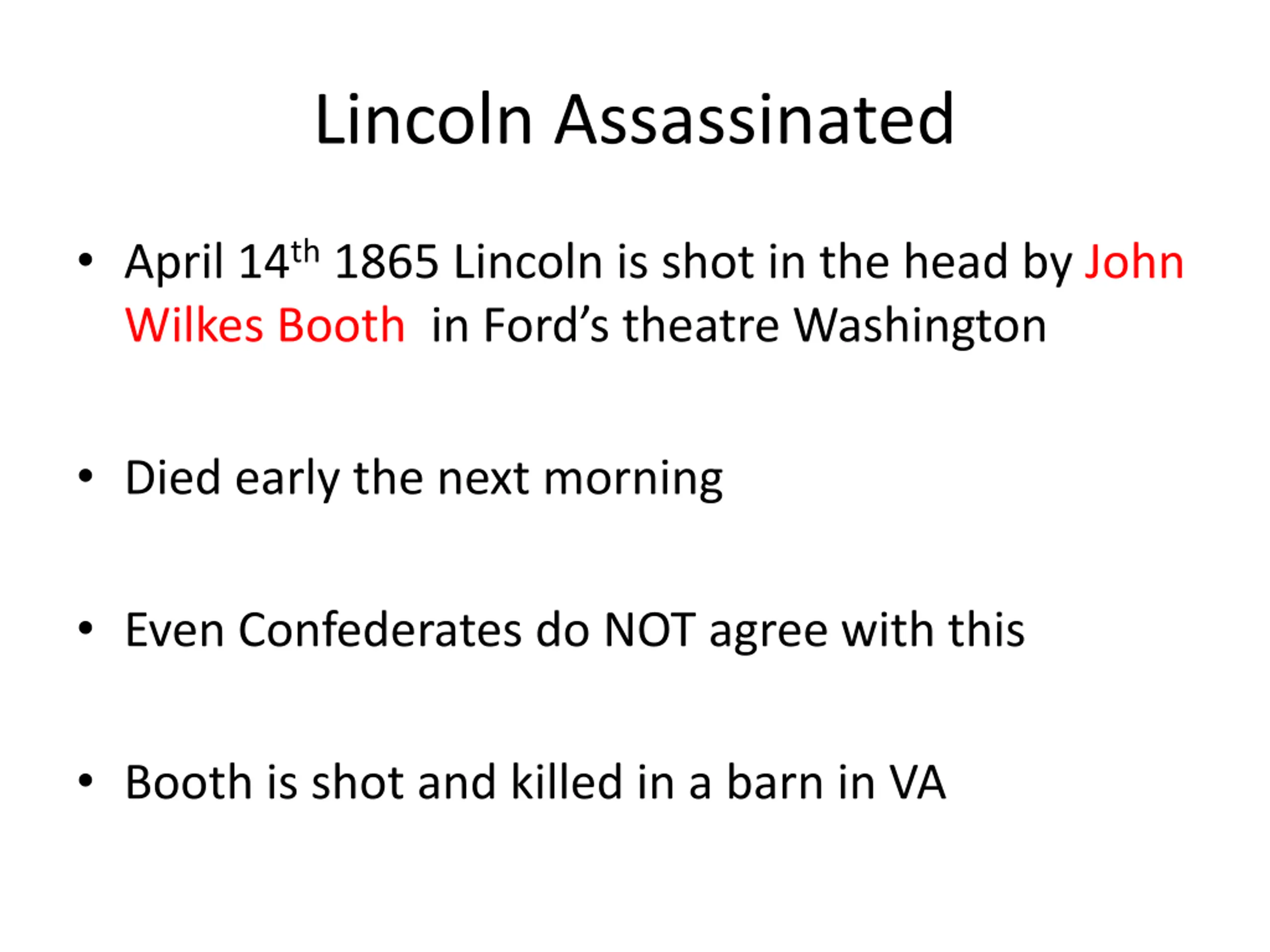 Lincoln Assassinated April 14th1865 Lincoln is shot in the head by John Wilkes Booth in Ford s theatre Washington Died early the next morning Even Confederates do NOT agree with this Booth is shot and killed in a barn in VA