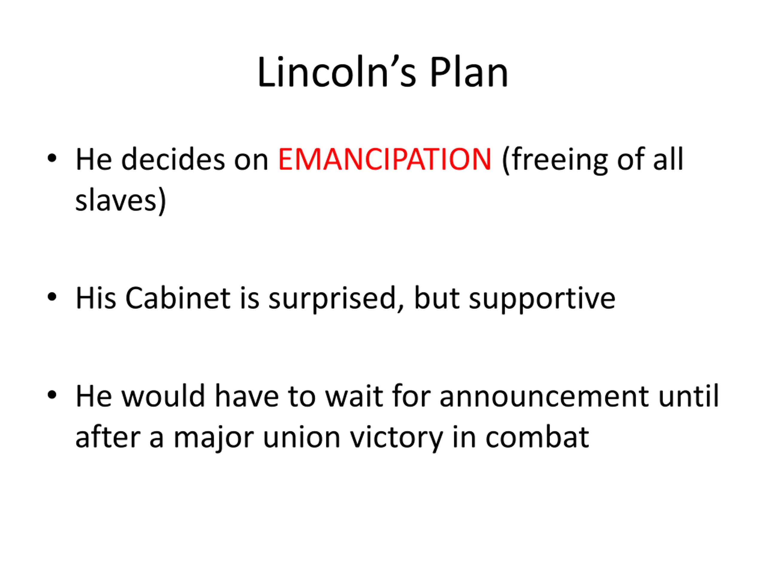 Lincolns Plan He decides on EMANCIPATION (freeing of all slaves) His Cabinet is surprised, but supportive He would have to wait for announcement until after a major union victory in combat