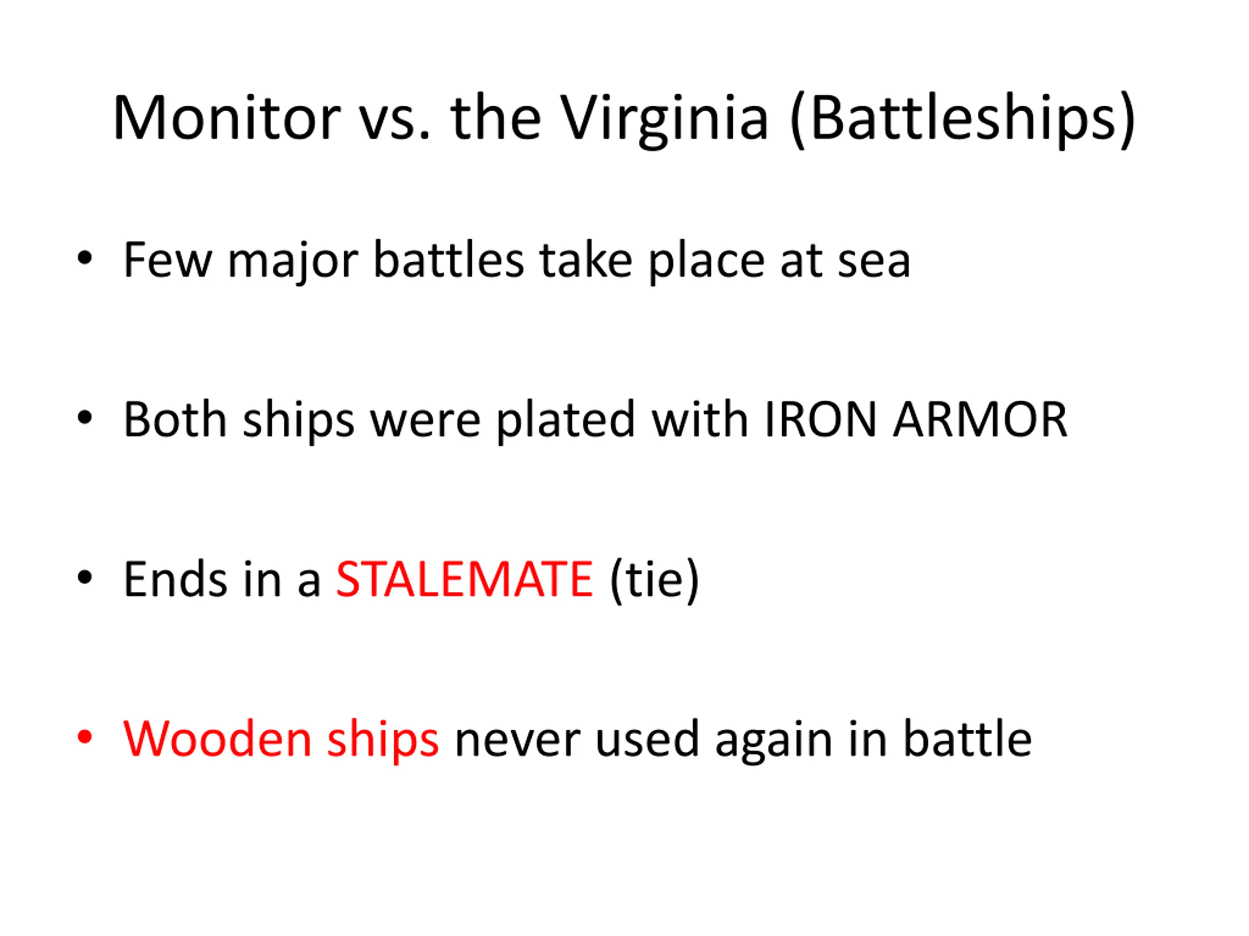 Monitor vs. the Virginia (Battleships) Few major battles take place at sea Both ships were plated with IRON ARMOR Ends in a STALEMATE (tie) Wooden ships never used again in battle