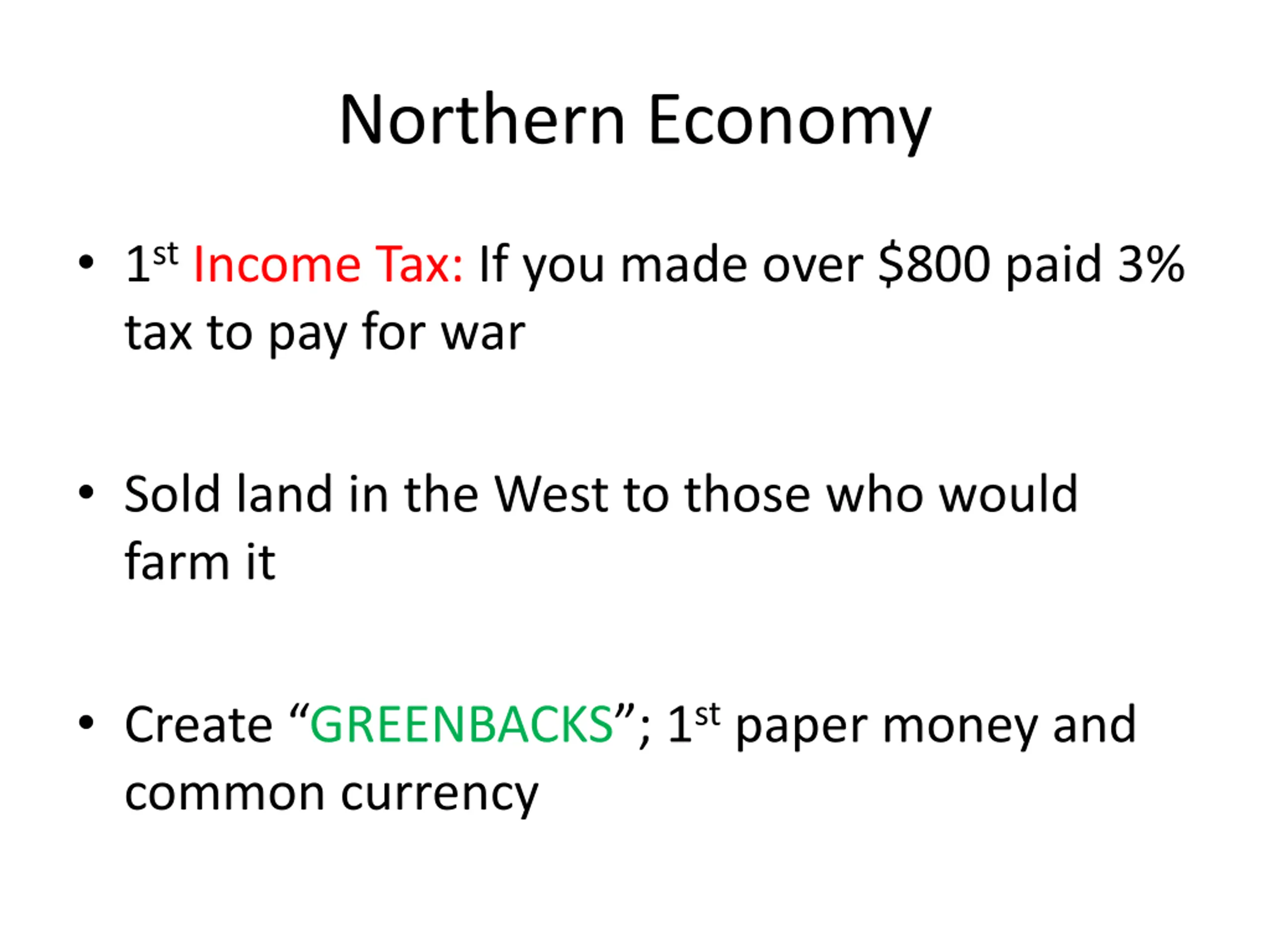 Northern Economy 1stIncome Tax: If you made over $800 paid 3% tax to pay for war Sold land in the West to those who would farm it Create GREENBACKS ; 1stpaper money and common currency