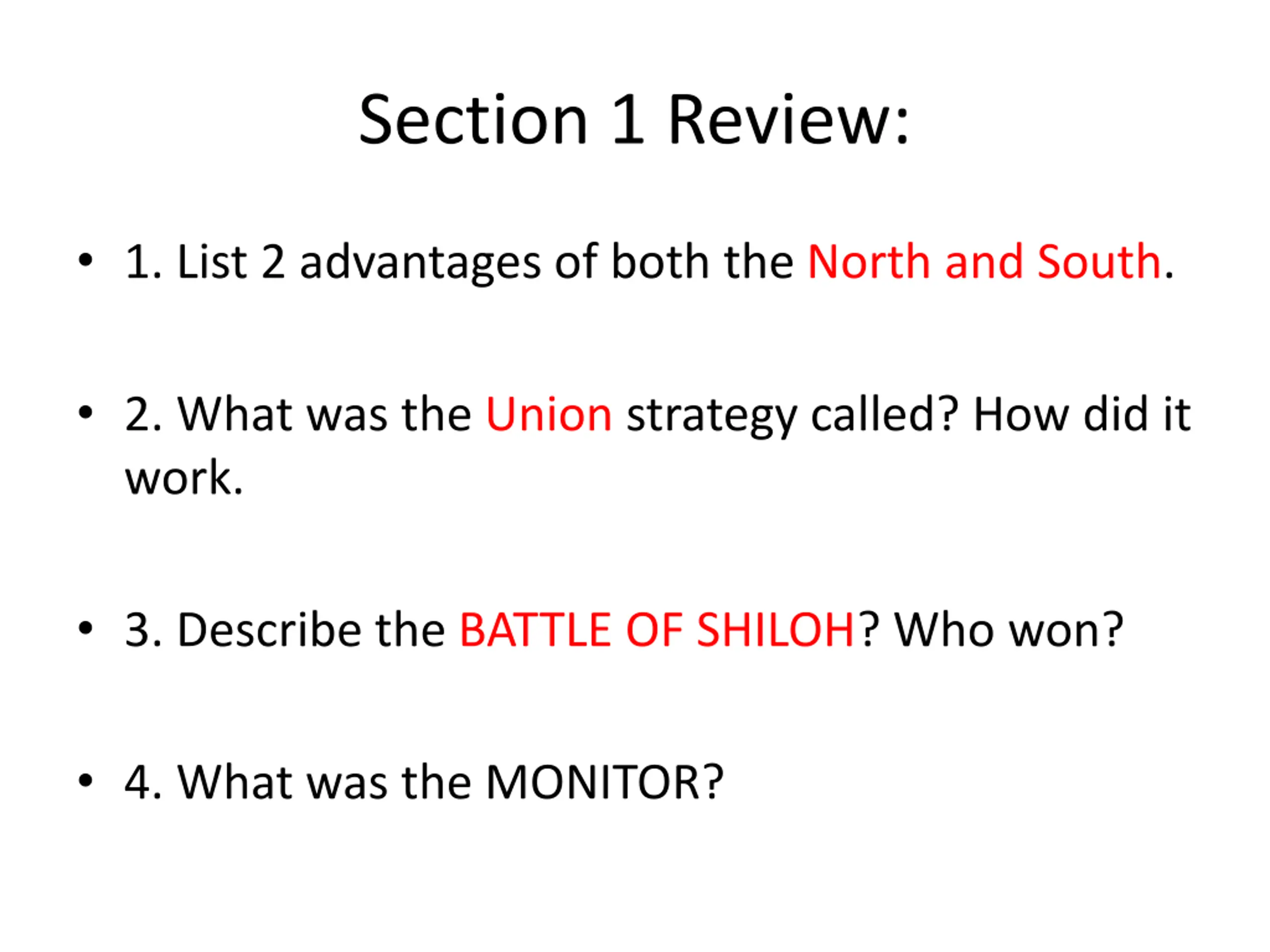 Section 1 Review: 1. List 2 advantages of both the North and South. 2. What was the Union strategy called? How did it work. 3. Describe the BATTLE OF SHILOH? Who won? 4. What was the MONITOR?