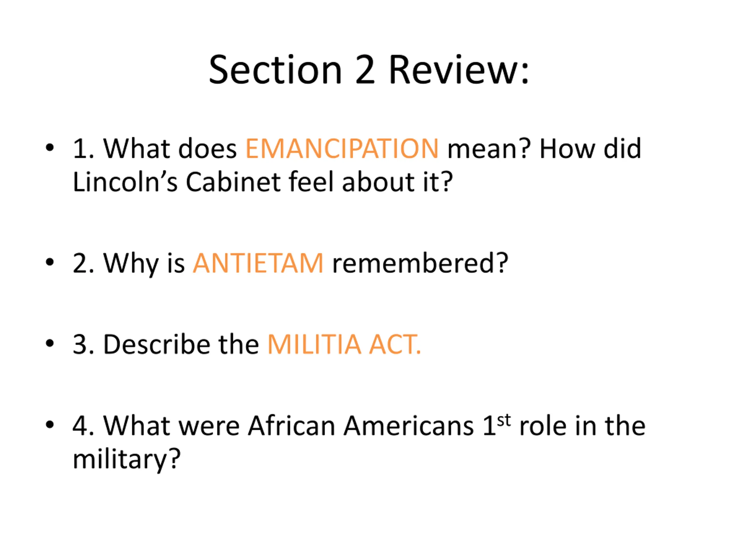 Section 2 Review: 1. What does EMANCIPATION mean? How did Lincoln s Cabinet feel about it? 2. Why is ANTIETAM remembered? 3. Describe the MILITIA ACT. 4. What were African Americans 1strole in the military?