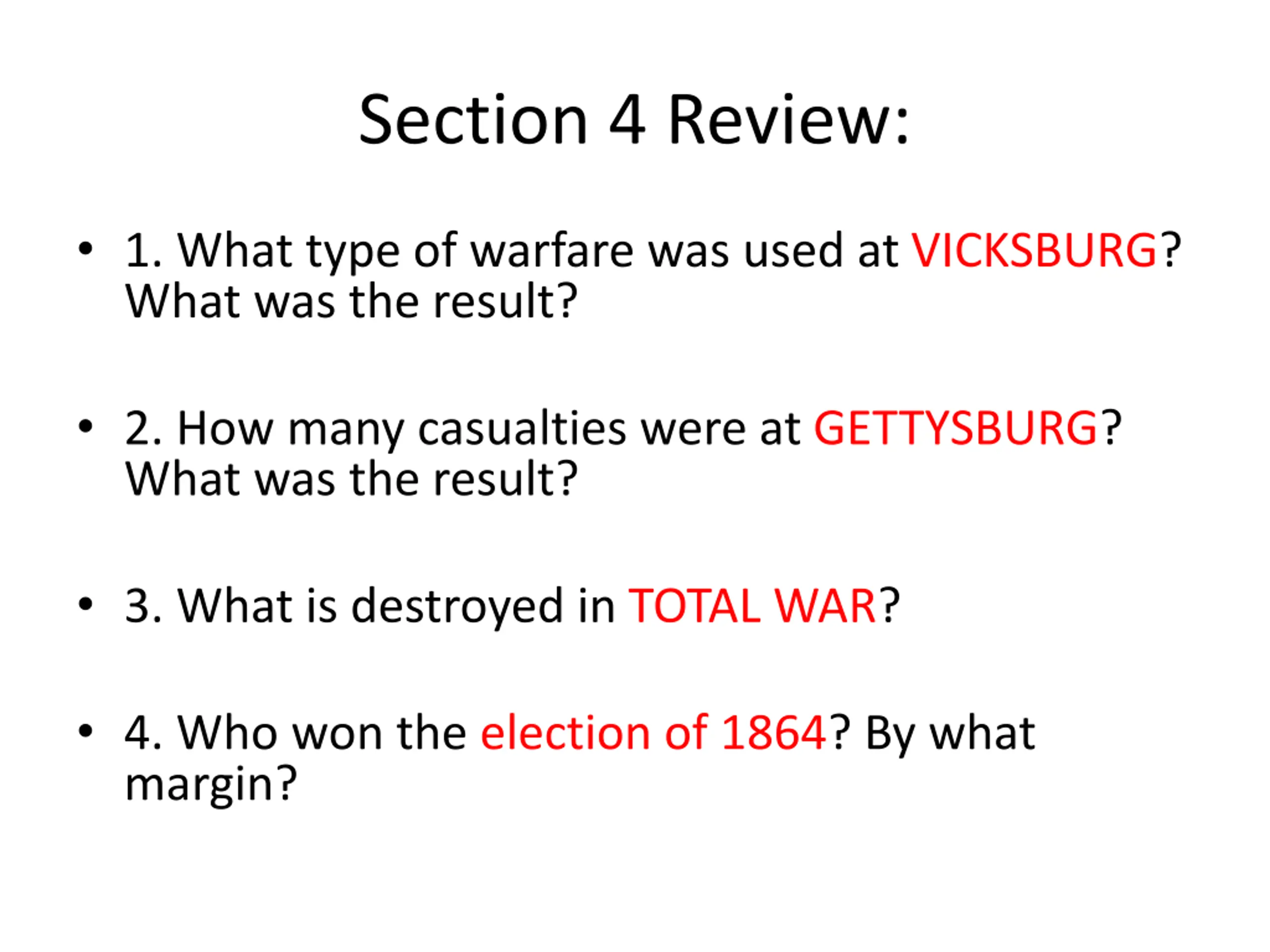 Section 4 Review: 1. What type of warfare was used at VICKSBURG? What was the result? 2. How many casualties were at GETTYSBURG? What was the result? 3. What is destroyed in TOTAL WAR? 4. Who won the election of 1864? By what margin?