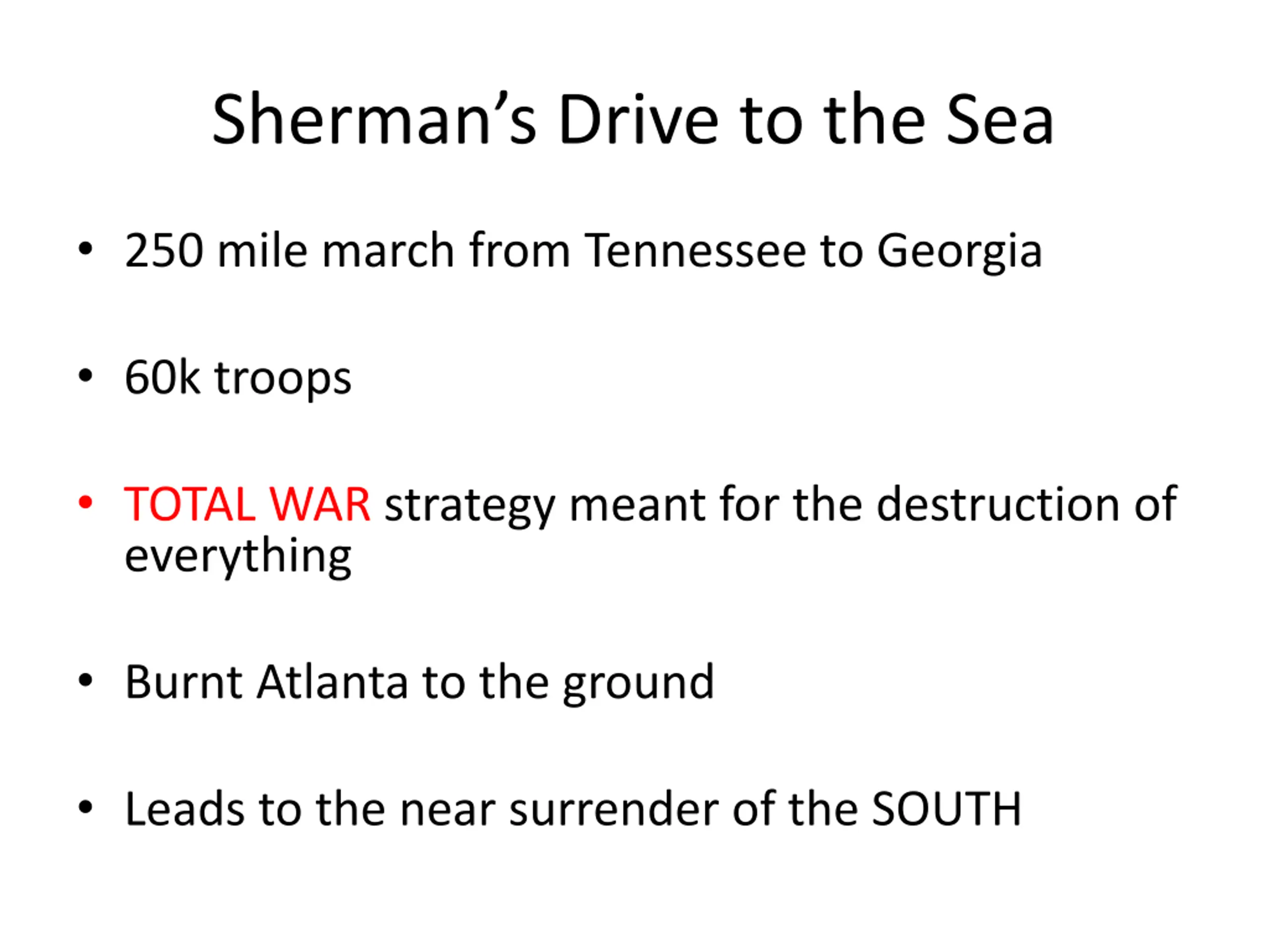 Shermans Drive to the Sea 250 mile march from Tennessee to Georgia 60k troops TOTAL WAR strategy meant for the destruction of everything Burnt Atlanta to the ground Leads to the near surrender of the SOUTH