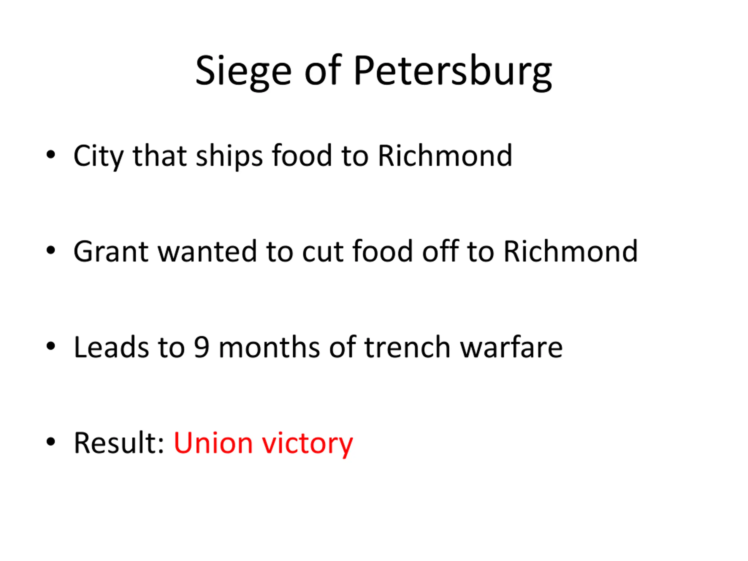 Siege of Petersburg City that ships food to Richmond Grant wanted to cut food off to Richmond Leads to 9 months of trench warfare Result: Union victory