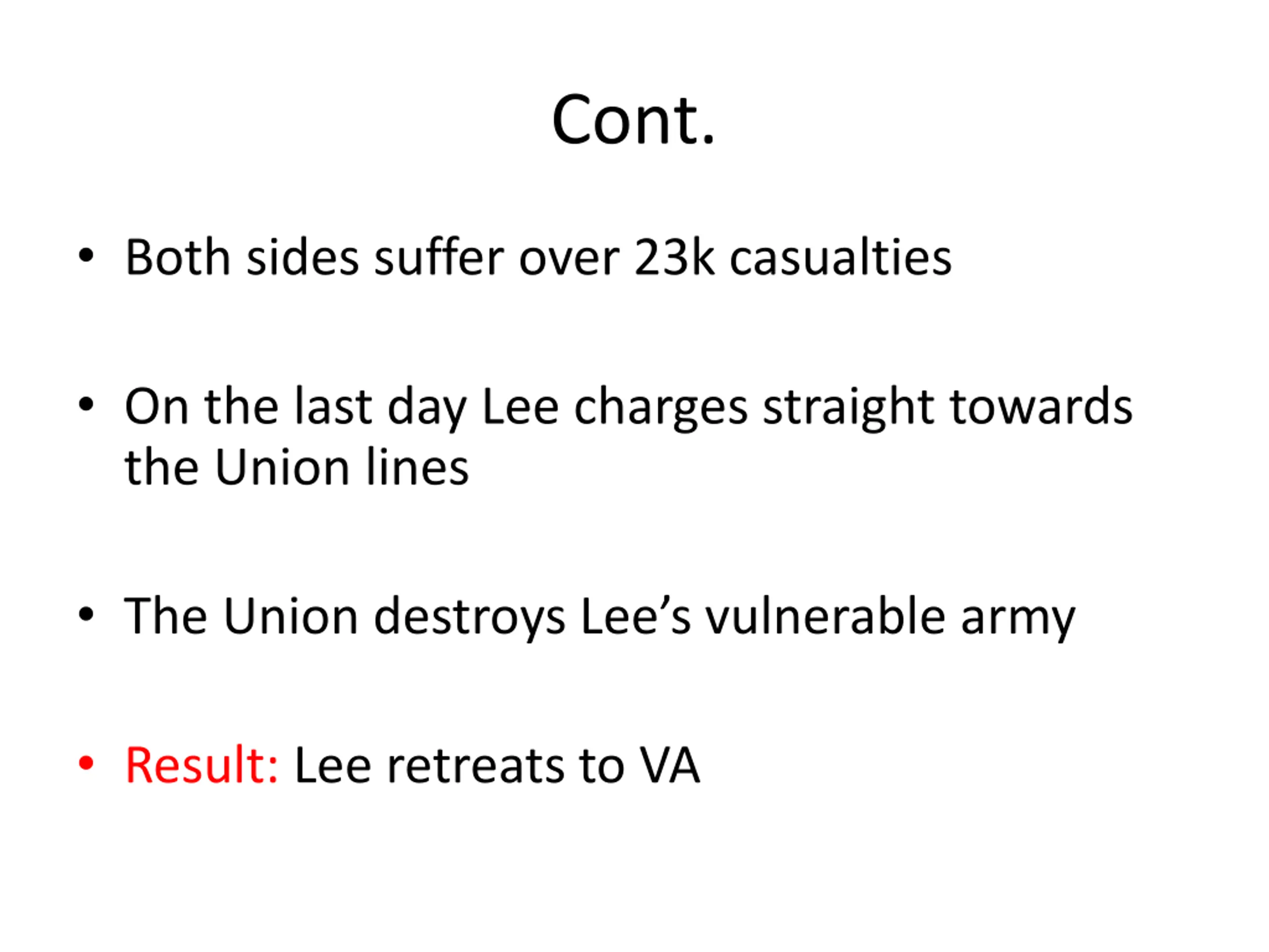 Cont. Both sides suffer over 23k casualties On the last day Lee charges straight towards the Union lines The Union destroys Lee s vulnerable army Result: Lee retreats to VA