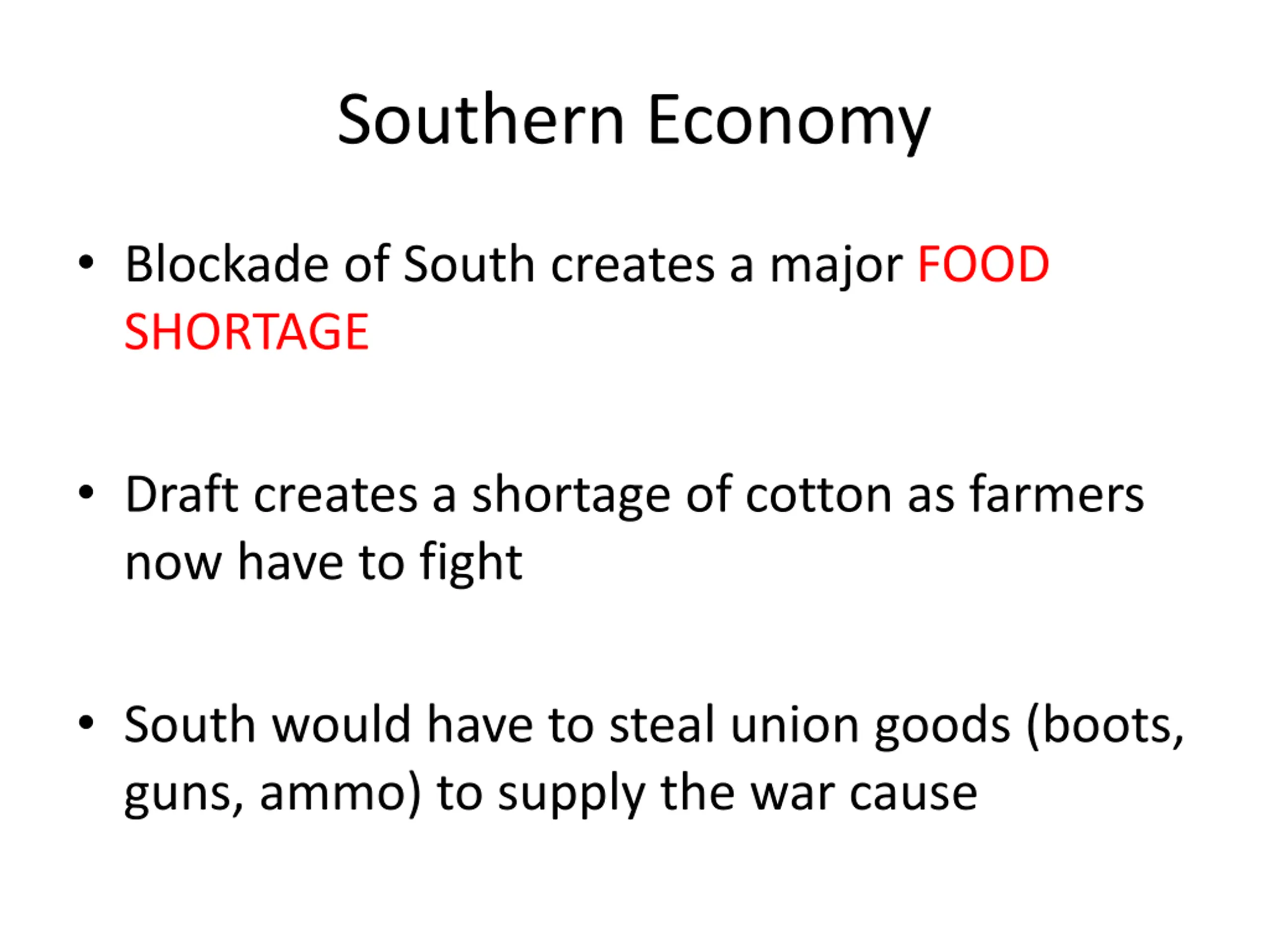 Southern Economy Blockade of South creates a major FOOD SHORTAGE Draft creates a shortage of cotton as farmers now have to fight South would have to steal union goods (boots, guns, ammo) to supply the war cause
