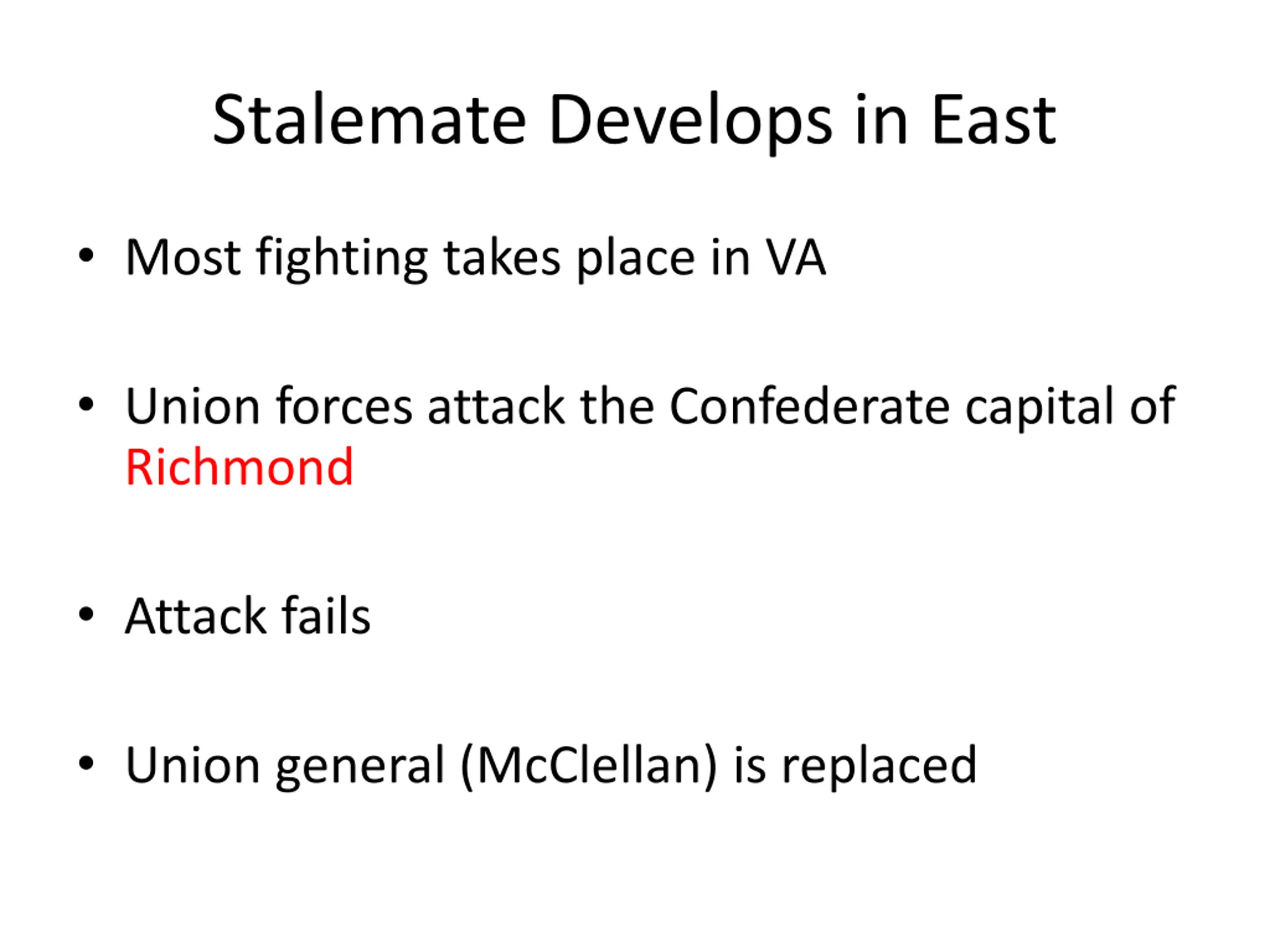 Stalemate Develops in East Most fighting takes place in VA Union forces attack the Confederate capital of Richmond Attack fails Union general (McClellan) is replaced
