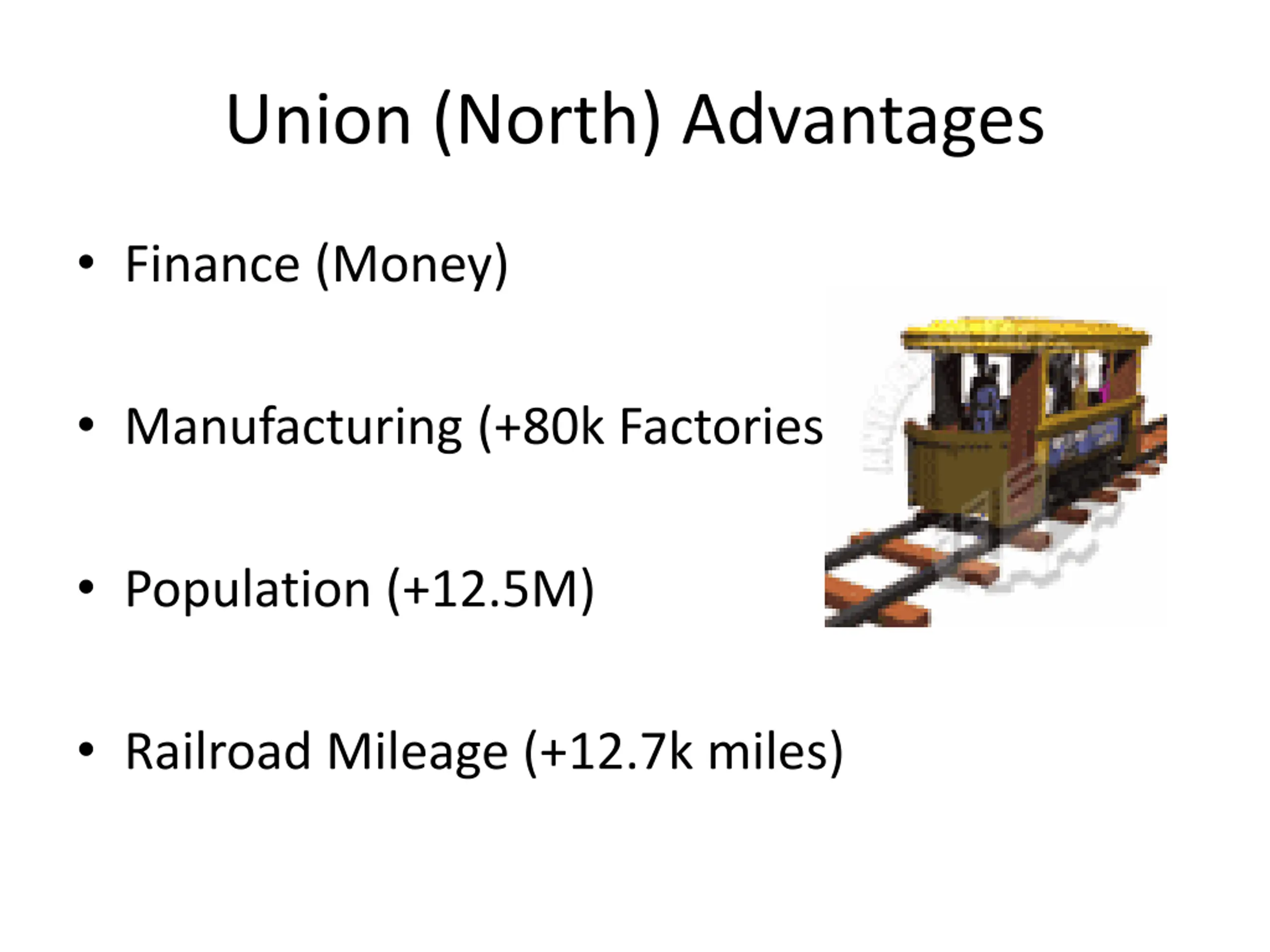 Union (North) Advantages Finance (Money) Trolley Car on Tracks Animated Clipart Manufacturing (+80k Factories) Population (+12.5M) Railroad Mileage (+12.7k miles)