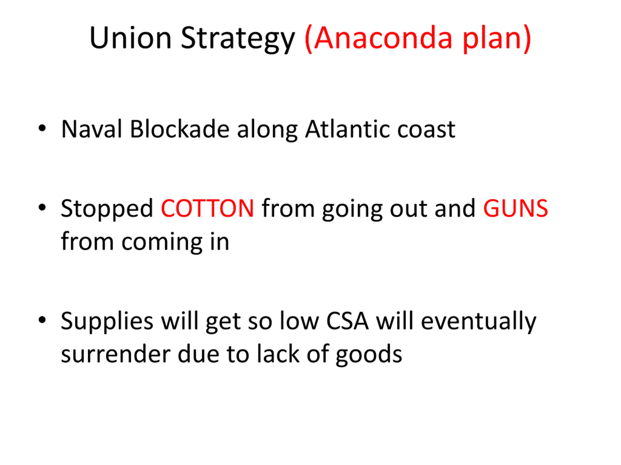 Union Strategy (Anaconda plan) Naval Blockade along Atlantic coast Stopped COTTON from going out and GUNS from coming in Supplies will get so low CSA will eventually surrender due to lack of goods