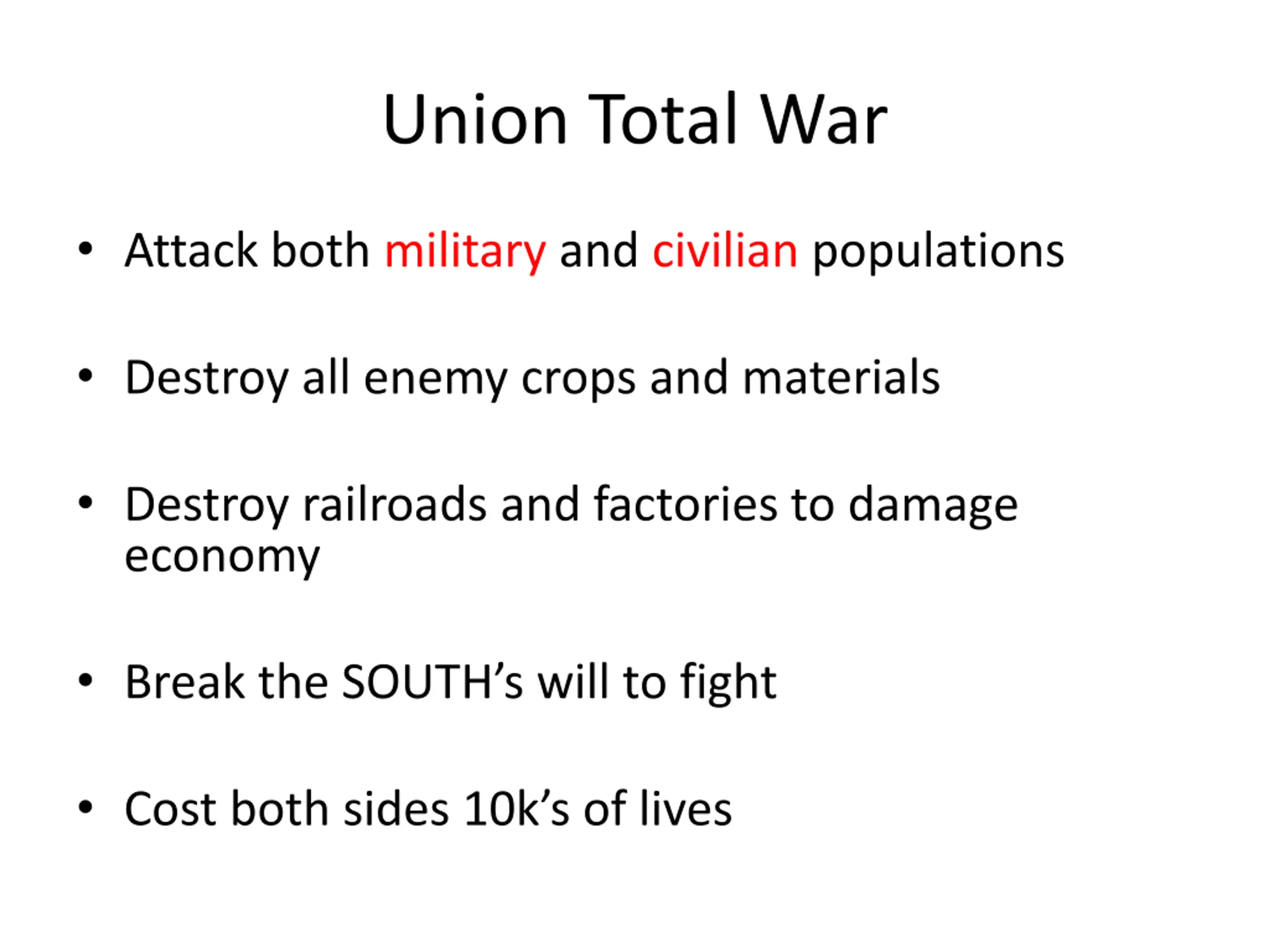 Union Total War Attack both military and civilian populations Destroy all enemy crops and materials Destroy railroads and factories to damage economy Break the SOUTH s will to fight Cost both sides 10k s of lives