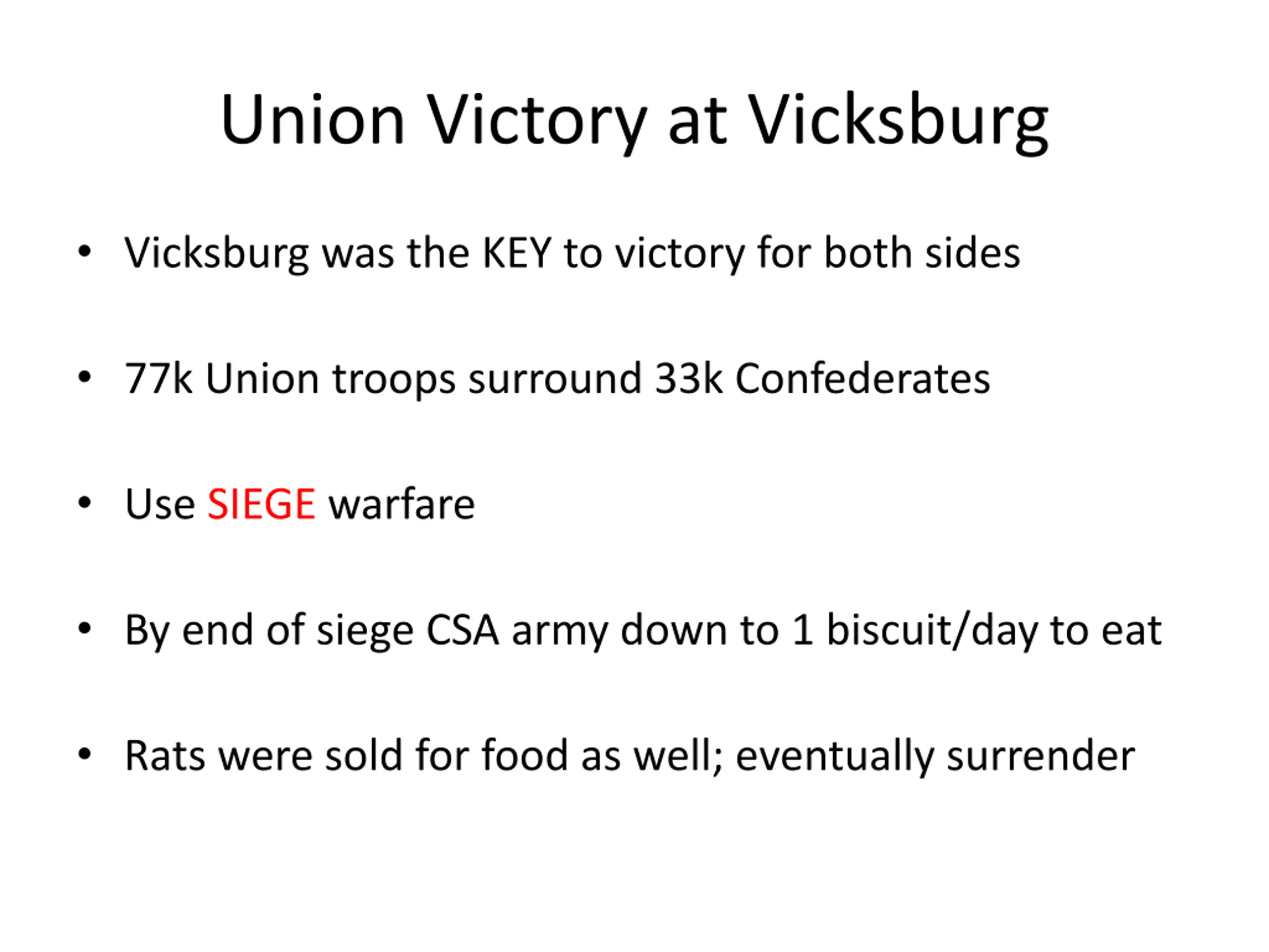 Union Victory at Vicksburg Vicksburg was the KEY to victory for both sides 77k Union troops surround 33k Confederates Use SIEGE warfare By end of siege CSA army down to 1 biscuit/day to eat Rats were sold for food as well; eventually surrender