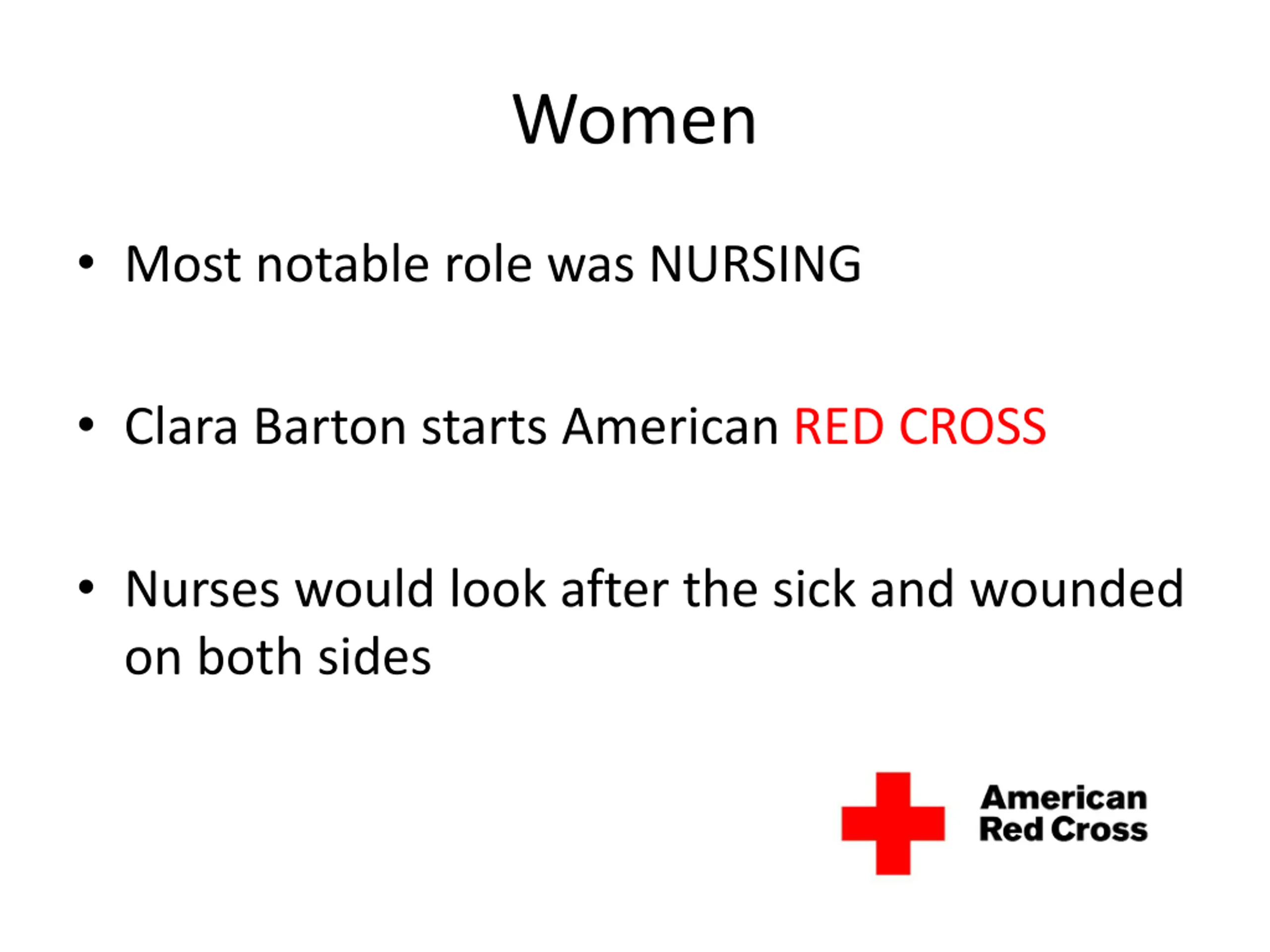 Women Most notable role was NURSING Clara Barton starts American RED CROSS Nurses would look after the sick and wounded on both sides