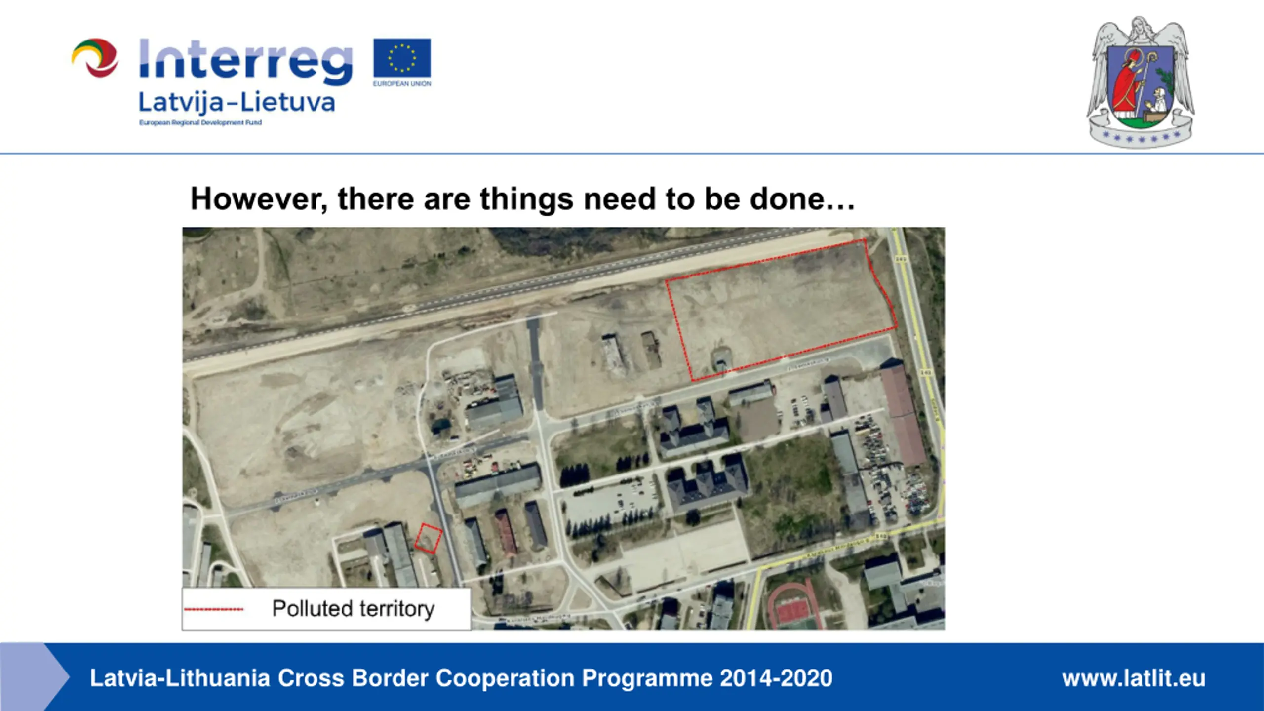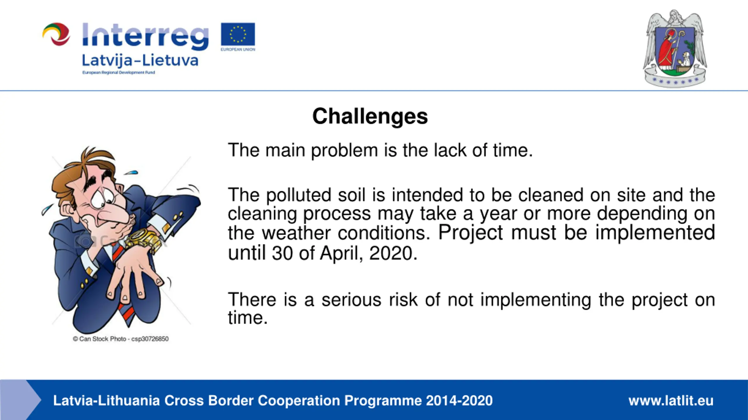 Challenges The main problem is the lack of time. The polluted soil is intended to be cleaned on site and the cleaning process may take a year or more depending on the weather conditions. Project must be implemented until 30 of April, 2020. There is a serious risk of not implementing the project on time. Latvia-Lithuania Cross Border Cooperation Programme 2014-2020 www.latlit.eu