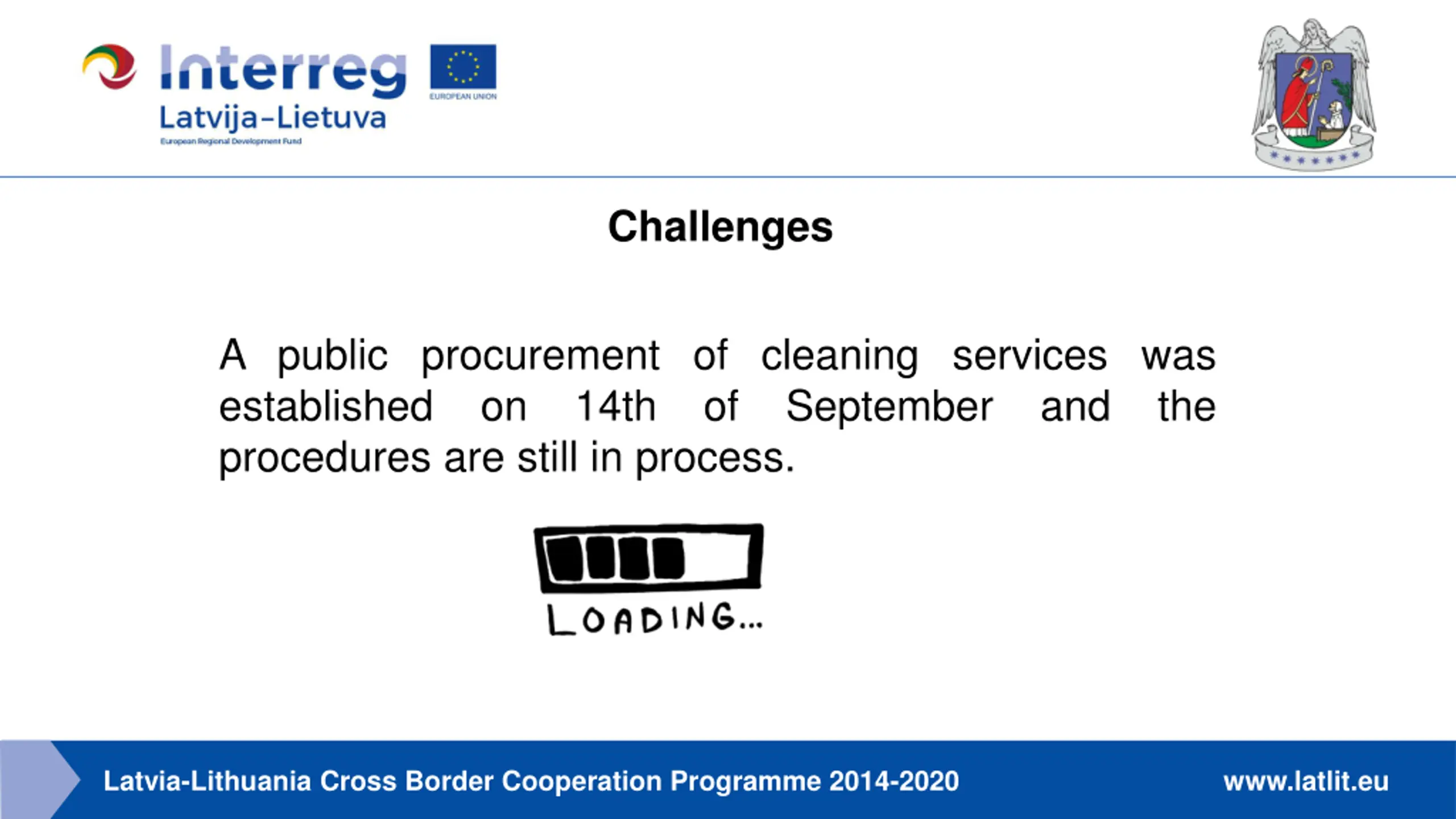 Challenges A public procurement of cleaning services was established on 14th of September and the procedures are still in process. Latvia-Lithuania Cross Border Cooperation Programme 2014-2020 www.latlit.eu