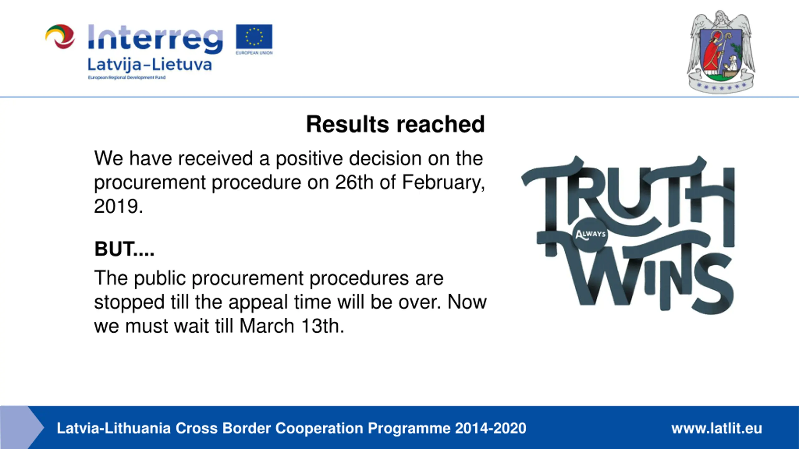 Results reached We have received a positive decision on the procurement procedure on 26th of February, 2019. BUT.... The public procurement procedures are stopped till the appeal time will be over. Now we must wait till March 13th. Latvia-Lithuania Cross Border Cooperation Programme 2014-2020 www.latlit.eu