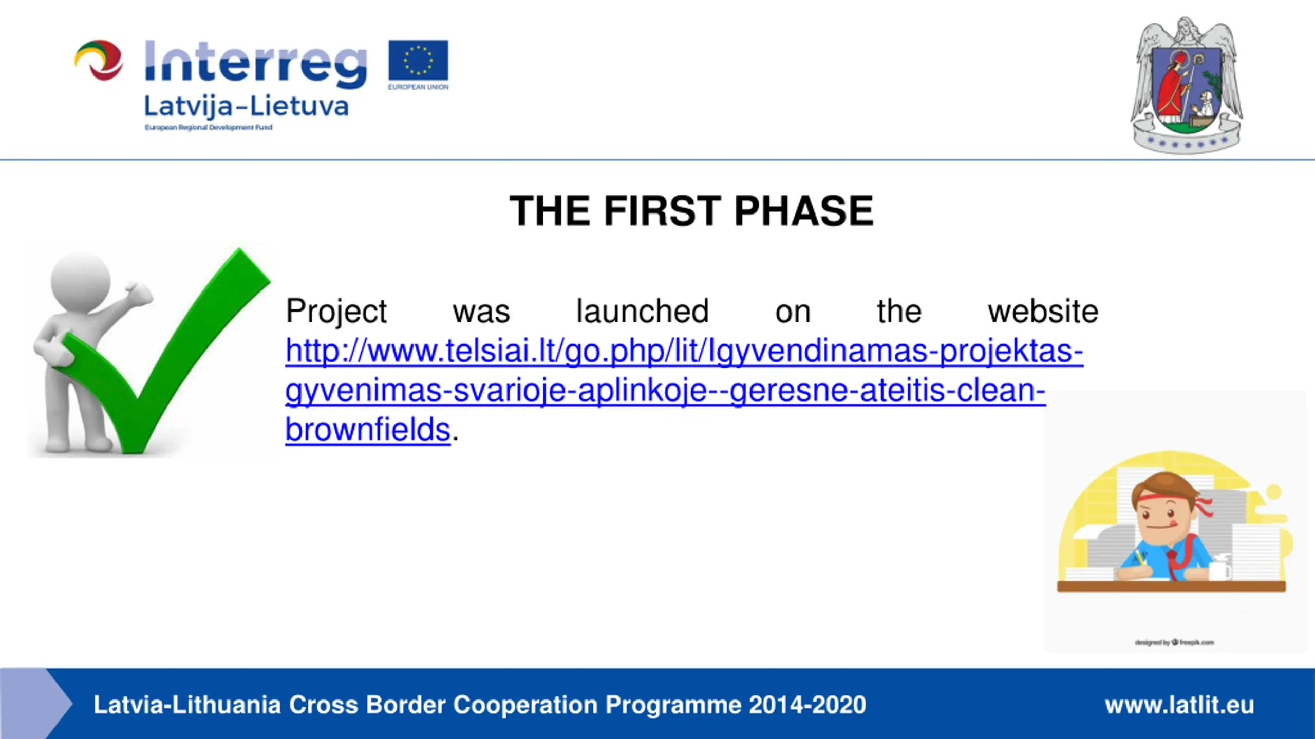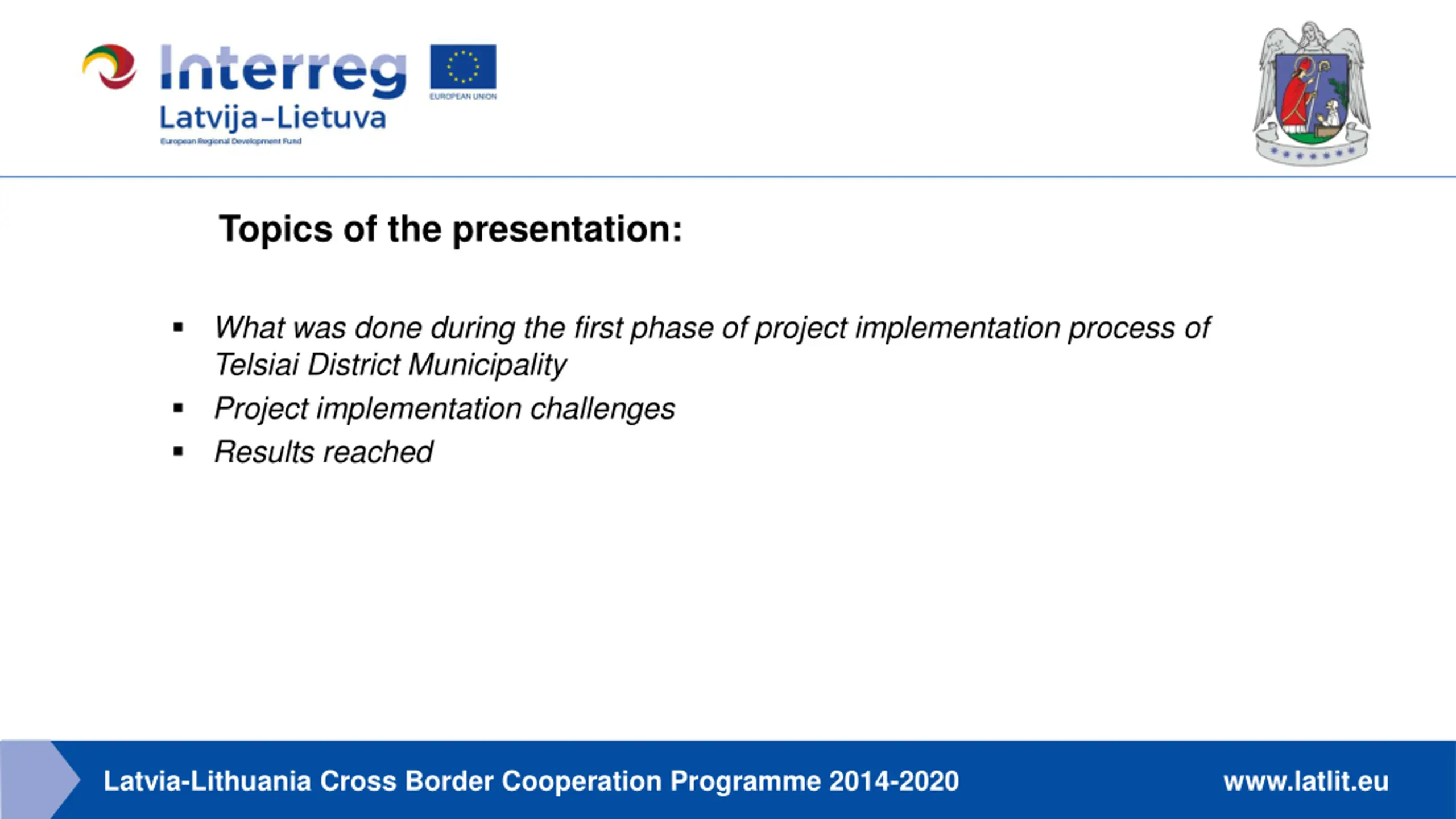 Topics of the presentation: What was done during the first phase of project implementation processof Telsiai District Municipality Project implementation challenges Results reached Latvia-Lithuania Cross Border Cooperation Programme 2014-2020 www.latlit.eu