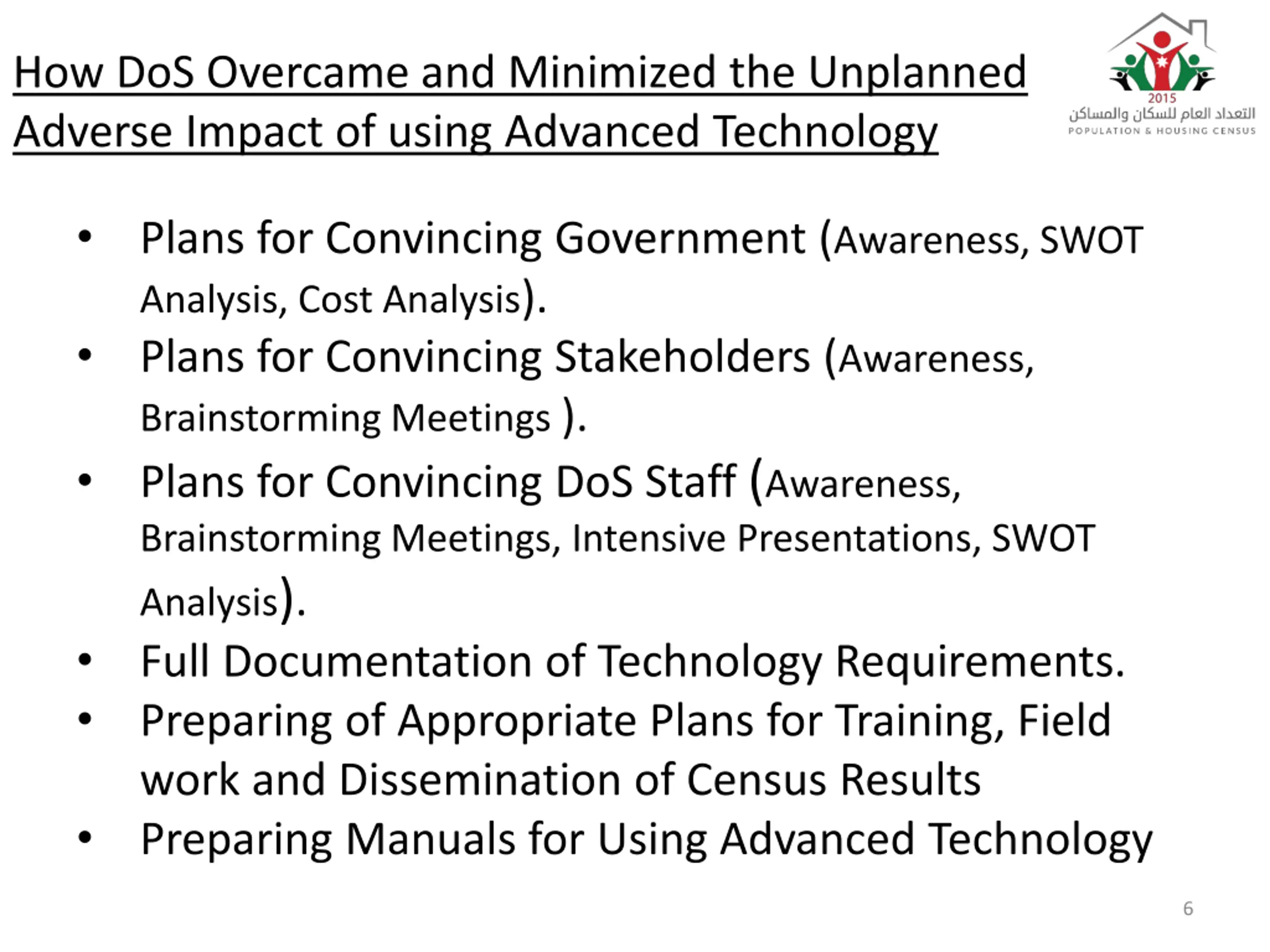 How DoS Overcame and Minimized the Unplanned Adverse Impact of using Advanced Technology Plans for Convincing Government (Awareness, SWOT Analysis, Cost Analysis). Plans for Convincing Stakeholders (Awareness, Brainstorming Meetings ). Plans for Convincing DoS Staff (Awareness, Brainstorming Meetings, Intensive Presentations, SWOT Analysis). Full Documentation of Technology Requirements. Preparing of Appropriate Plans for Training, Field work and Dissemination of Census Results Preparing Manuals for Using Advanced Technology 6