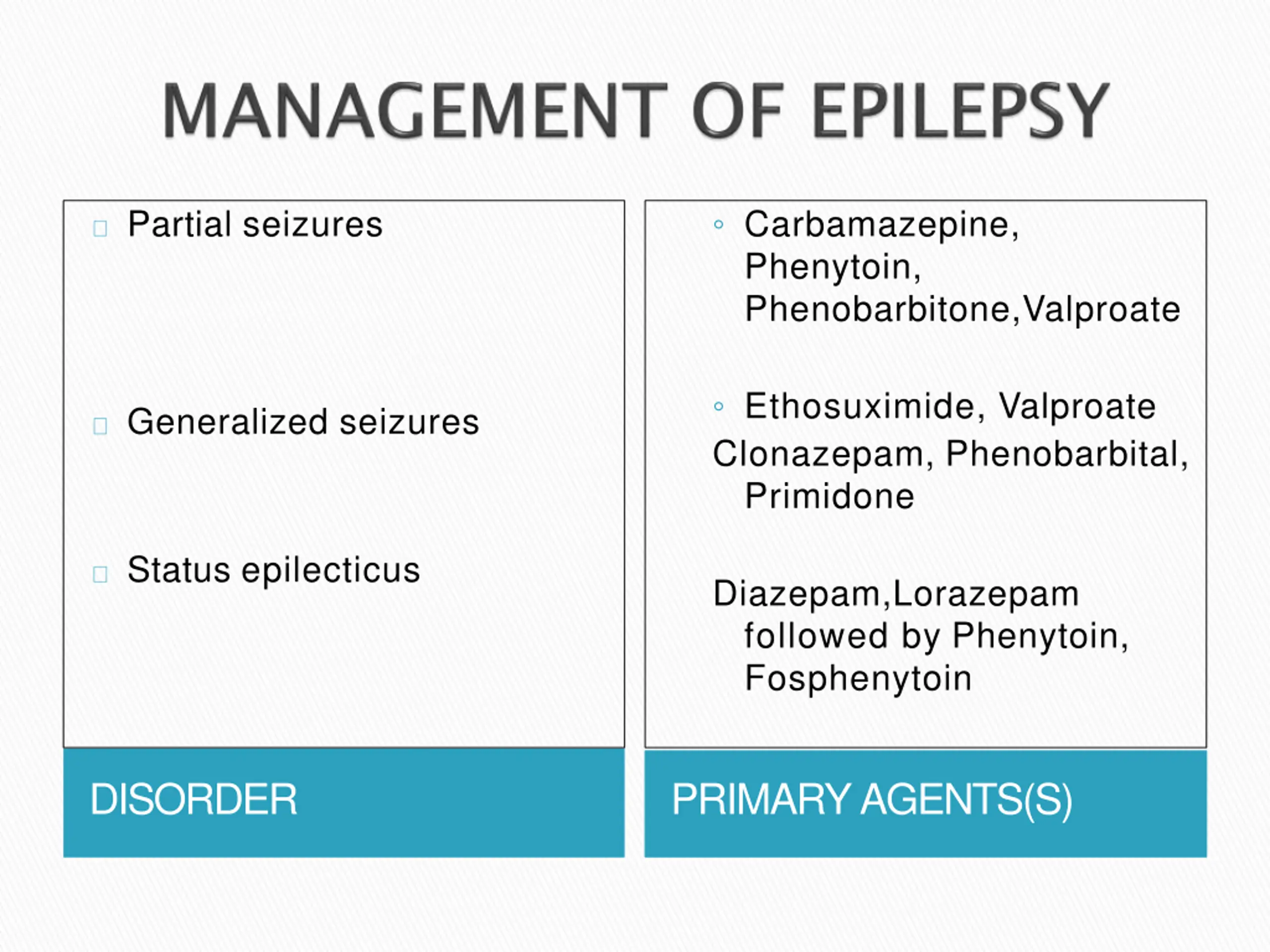 Carbamazepine, Phenytoin, Phenobarbitone,Valproate Partial seizures Ethosuximide, Valproate Clonazepam, Phenobarbital, Primidone Generalized seizures Status epilecticus Diazepam,Lorazepam followed by Phenytoin, Fosphenytoin DISORDER PRIMARYAGENTS(S)