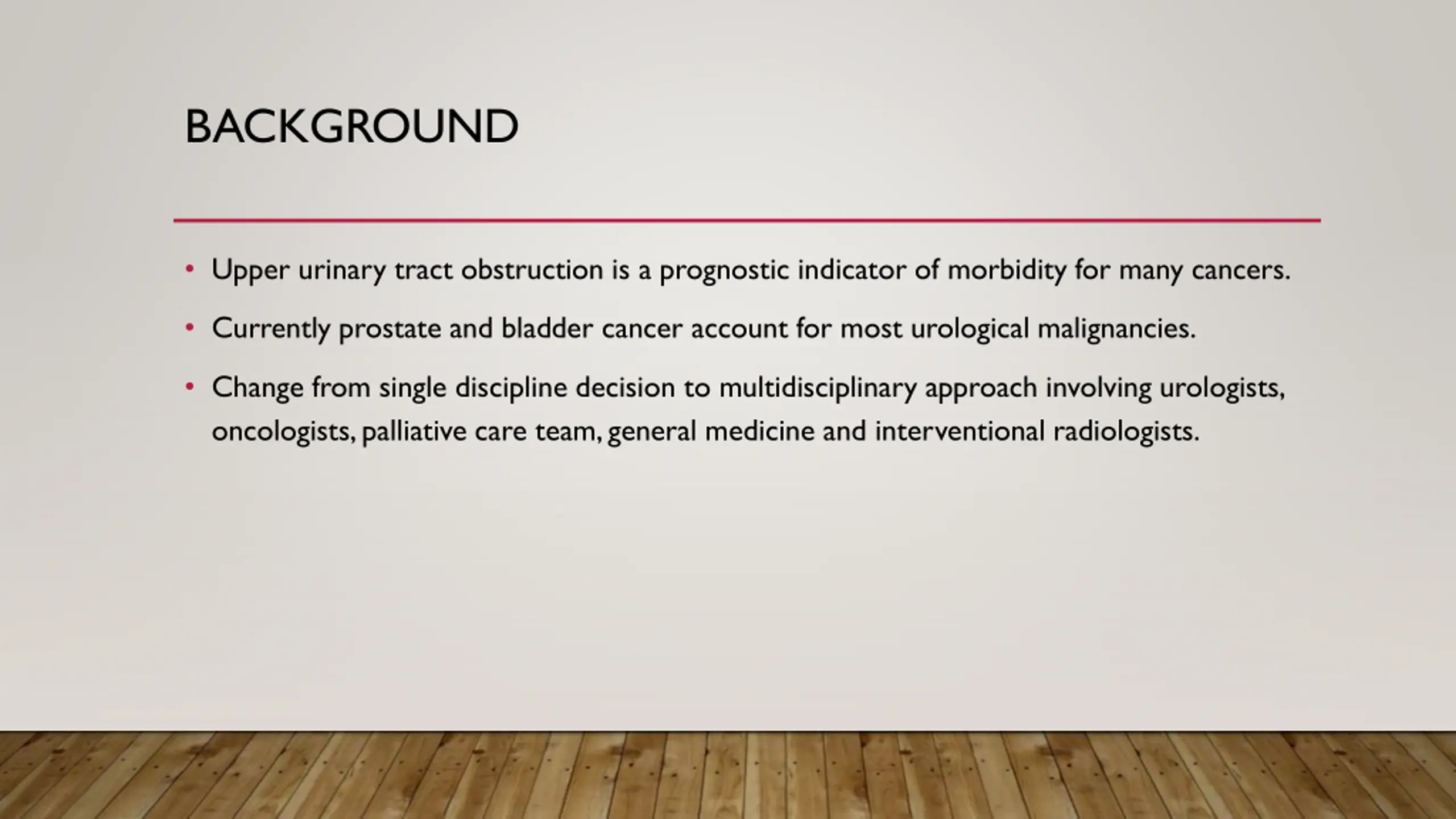 BACKGROUND Upper urinary tract obstruction is a prognostic indicator of morbidity for many cancers. Currently prostate and bladder cancer account for most urological malignancies. Change from single discipline decision to multidisciplinary approach involving urologists, oncologists, palliative care team, general medicine and interventional radiologists.
