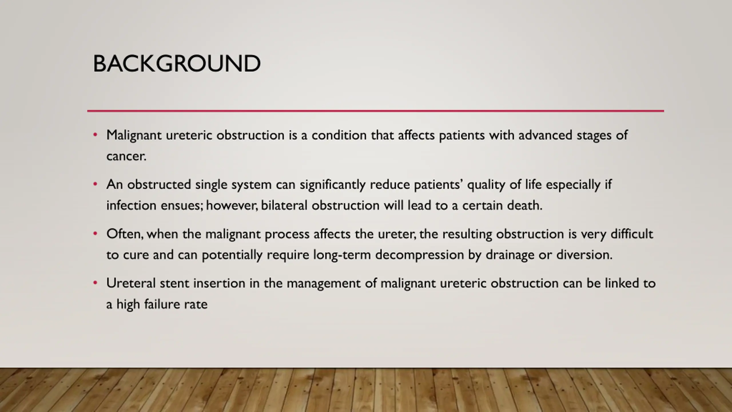 BACKGROUND Malignant ureteric obstruction is a condition that affects patients with advanced stages of cancer. An obstructed single system can significantly reduce patients quality of life especially if infection ensues; however, bilateral obstruction will lead to a certain death. Often, when the malignant process affects the ureter, the resulting obstruction is very difficult to cure and can potentially require long-term decompression by drainage or diversion. Ureteral stent insertion in the management of malignant ureteric obstruction can be linked to a high failure rate