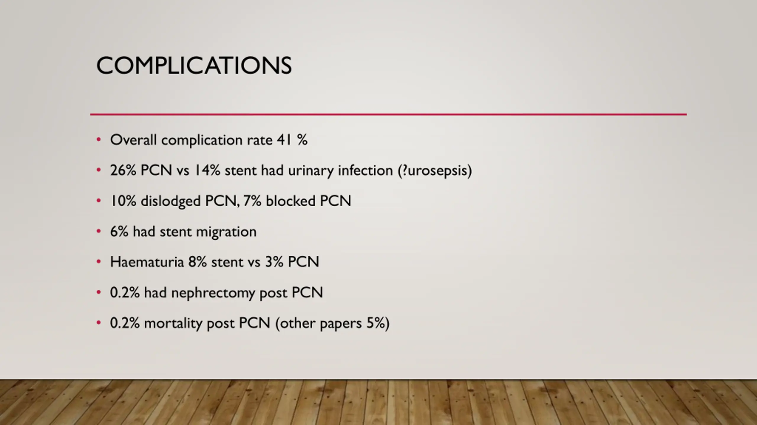 COMPLICATIONS Overall complication rate 41 % 26% PCN vs 14% stent had urinary infection (?urosepsis) 10% dislodged PCN, 7% blocked PCN 6% had stent migration Haematuria 8% stent vs 3% PCN 0.2% had nephrectomy post PCN 0.2% mortality post PCN (other papers 5%)
