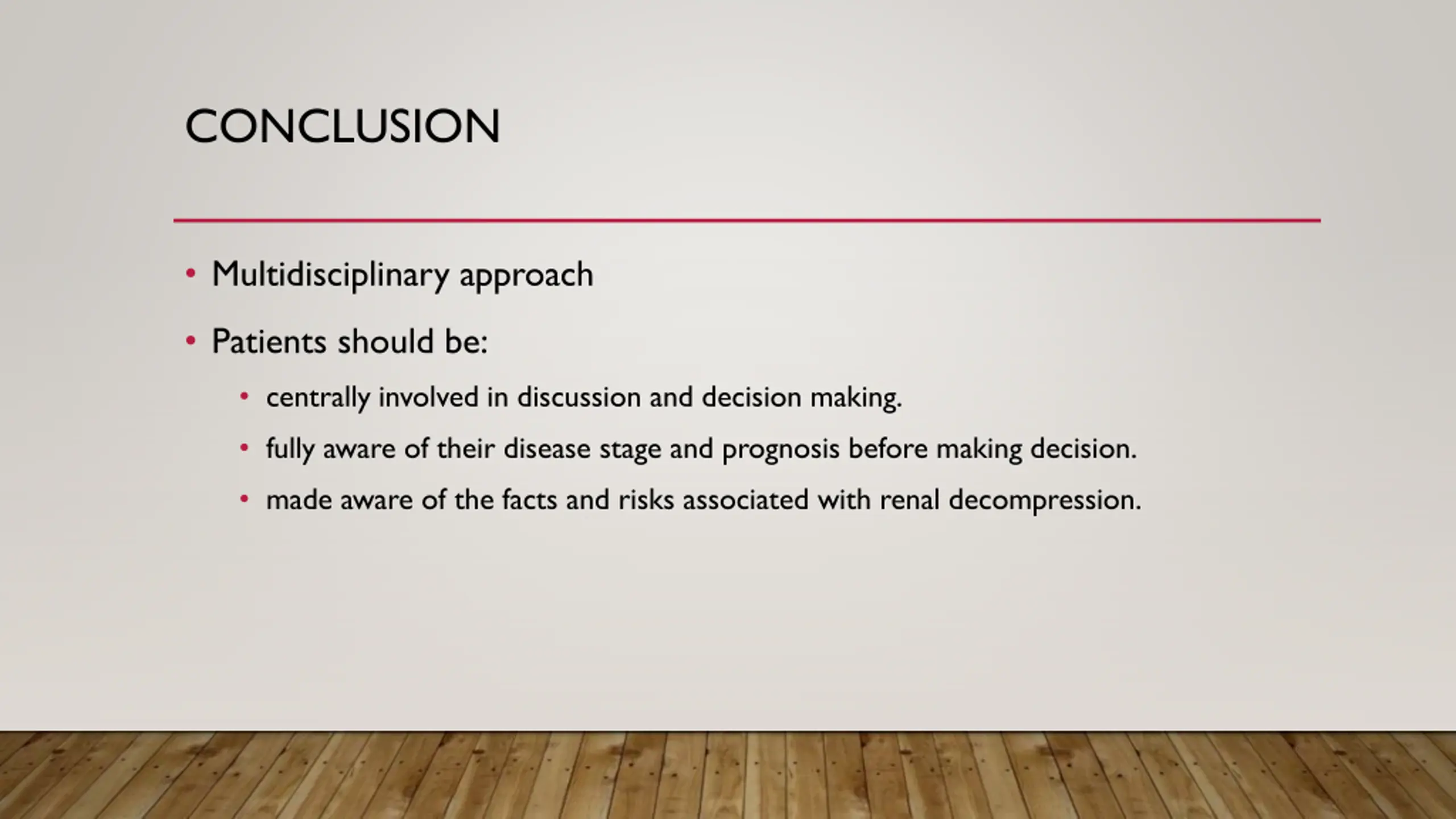 CONCLUSION Multidisciplinary approach Patients should be: centrally involved in discussion and decision making. fully aware of their disease stage and prognosis before making decision. made aware of the facts and risks associated with renal decompression.