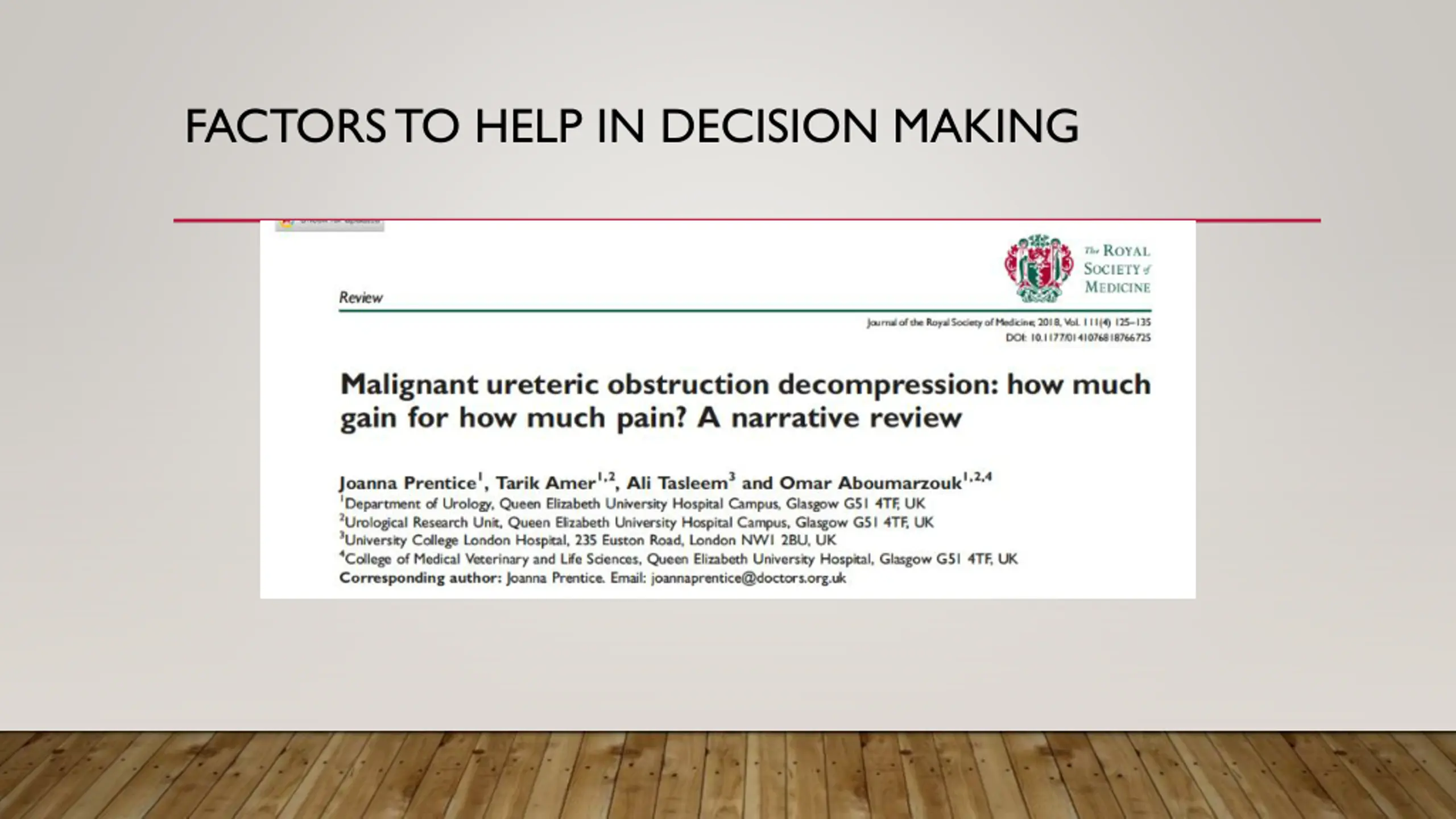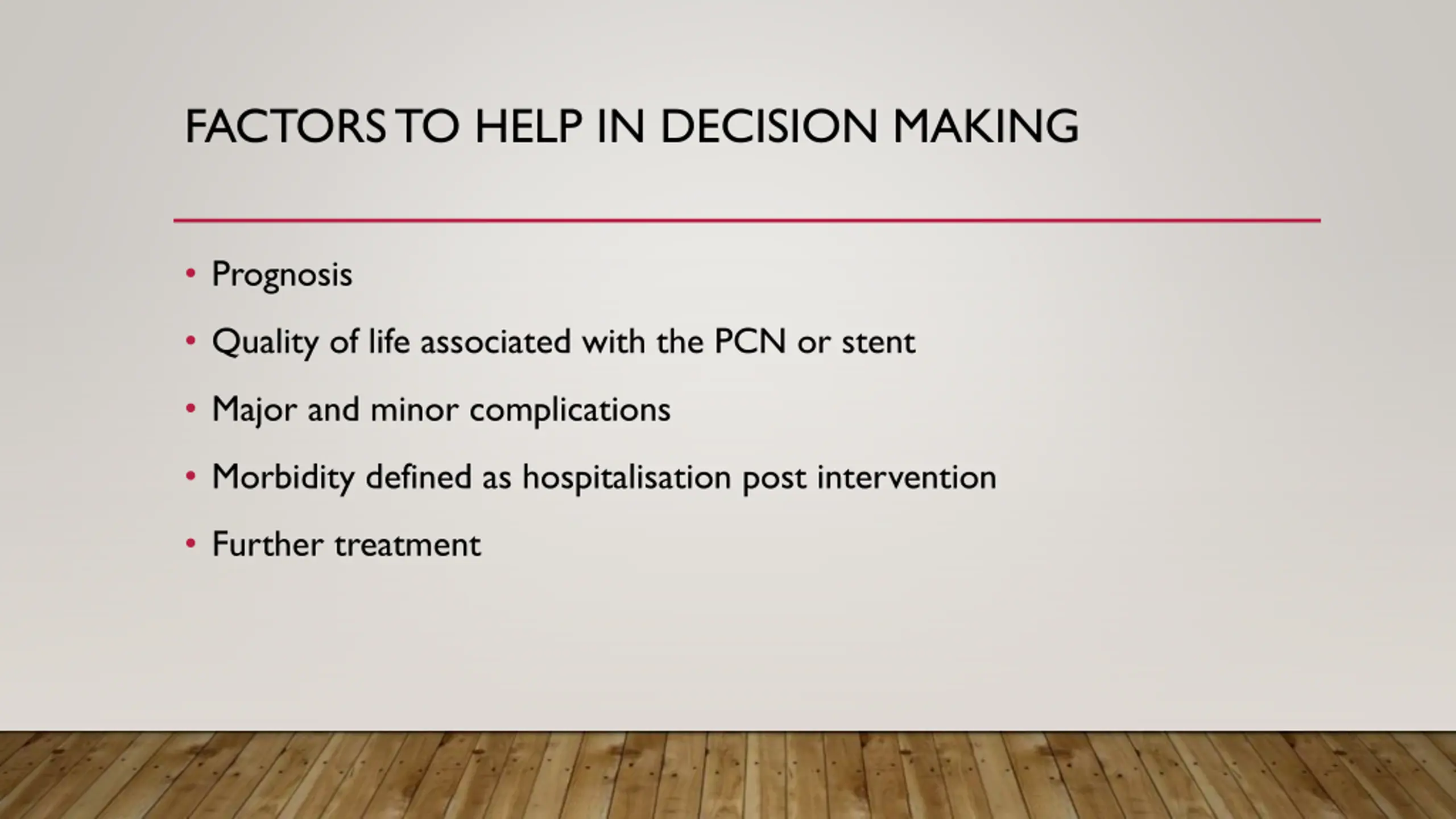 FACTORS TO HELP IN DECISION MAKING Prognosis Quality of life associated with the PCN or stent Major and minor complications Morbidity defined as hospitalisation post intervention Further treatment