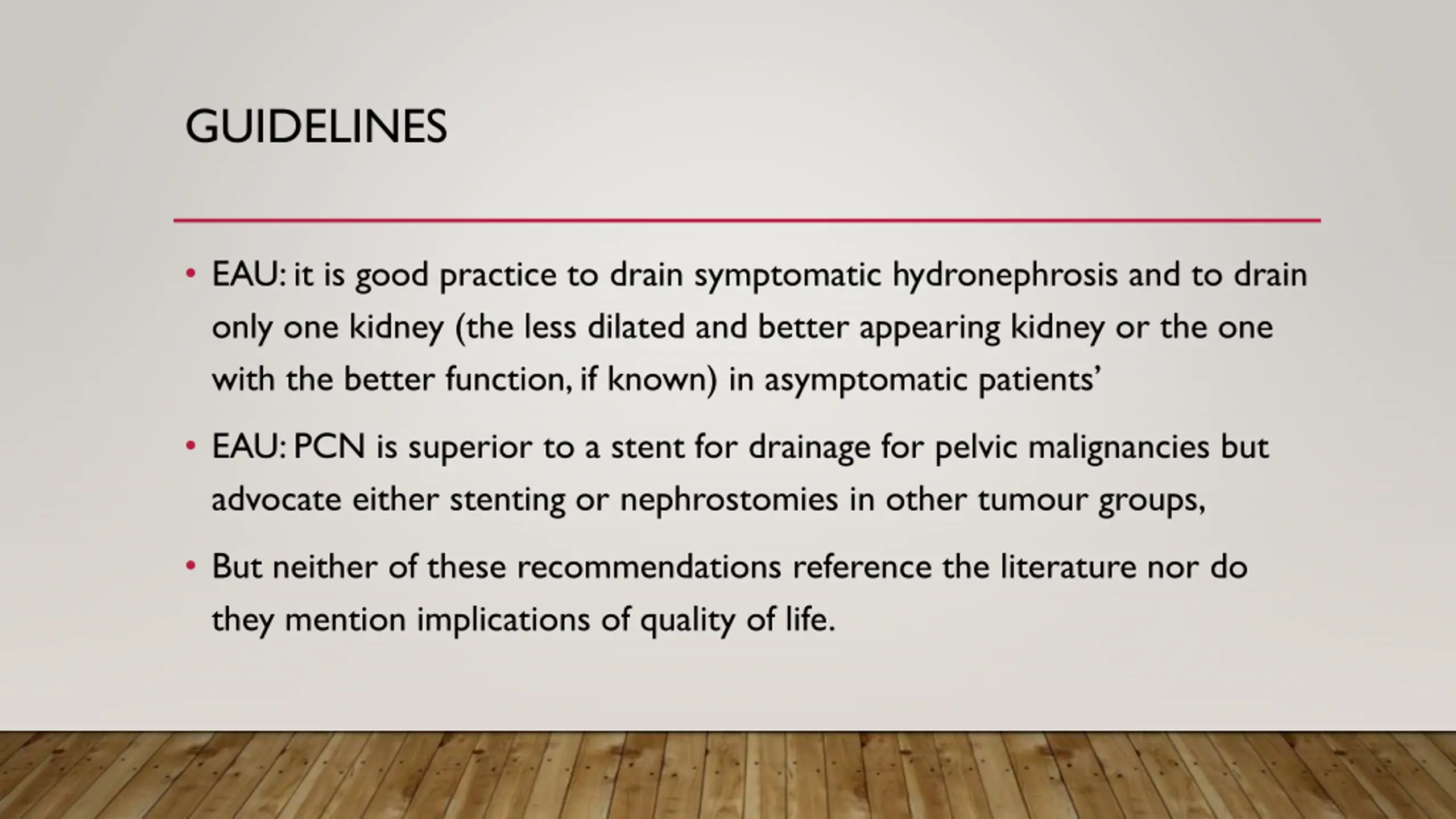 GUIDELINES EAU: it is good practice to drain symptomatic hydronephrosis and to drain only one kidney (the less dilated and better appearing kidney or the one with the better function, if known) in asymptomatic patients EAU: PCN is superior to a stent for drainage for pelvic malignancies but advocate either stenting or nephrostomies in other tumour groups, But neither of these recommendations reference the literature nor do they mention implications of quality of life.