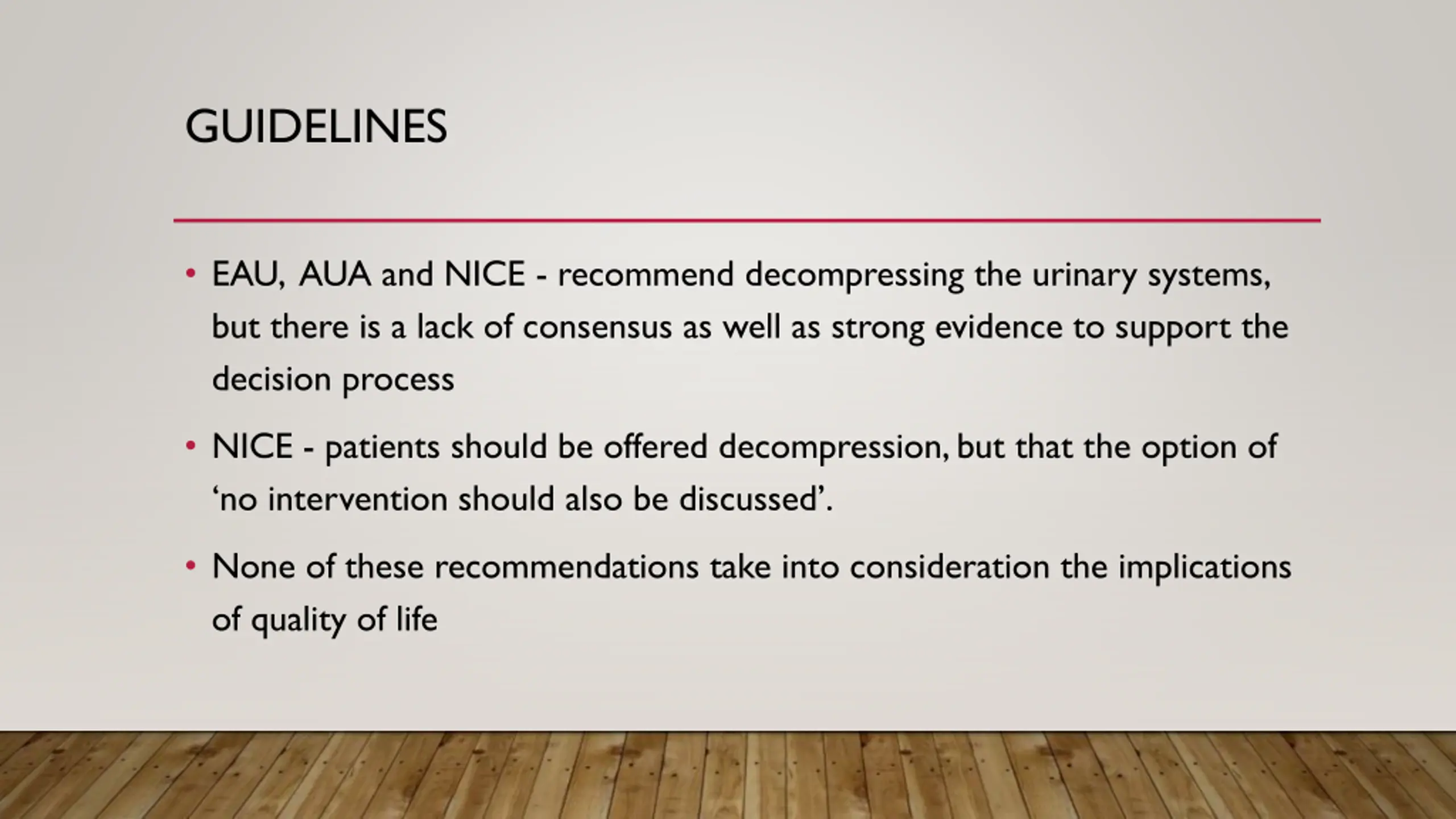 GUIDELINES EAU, AUA and NICE - recommend decompressing the urinary systems, but there is a lack of consensus as well as strong evidence to support the decision process NICE - patients should be offered decompression, but that the option of no intervention should also be discussed . None of these recommendations take into consideration the implications of quality of life