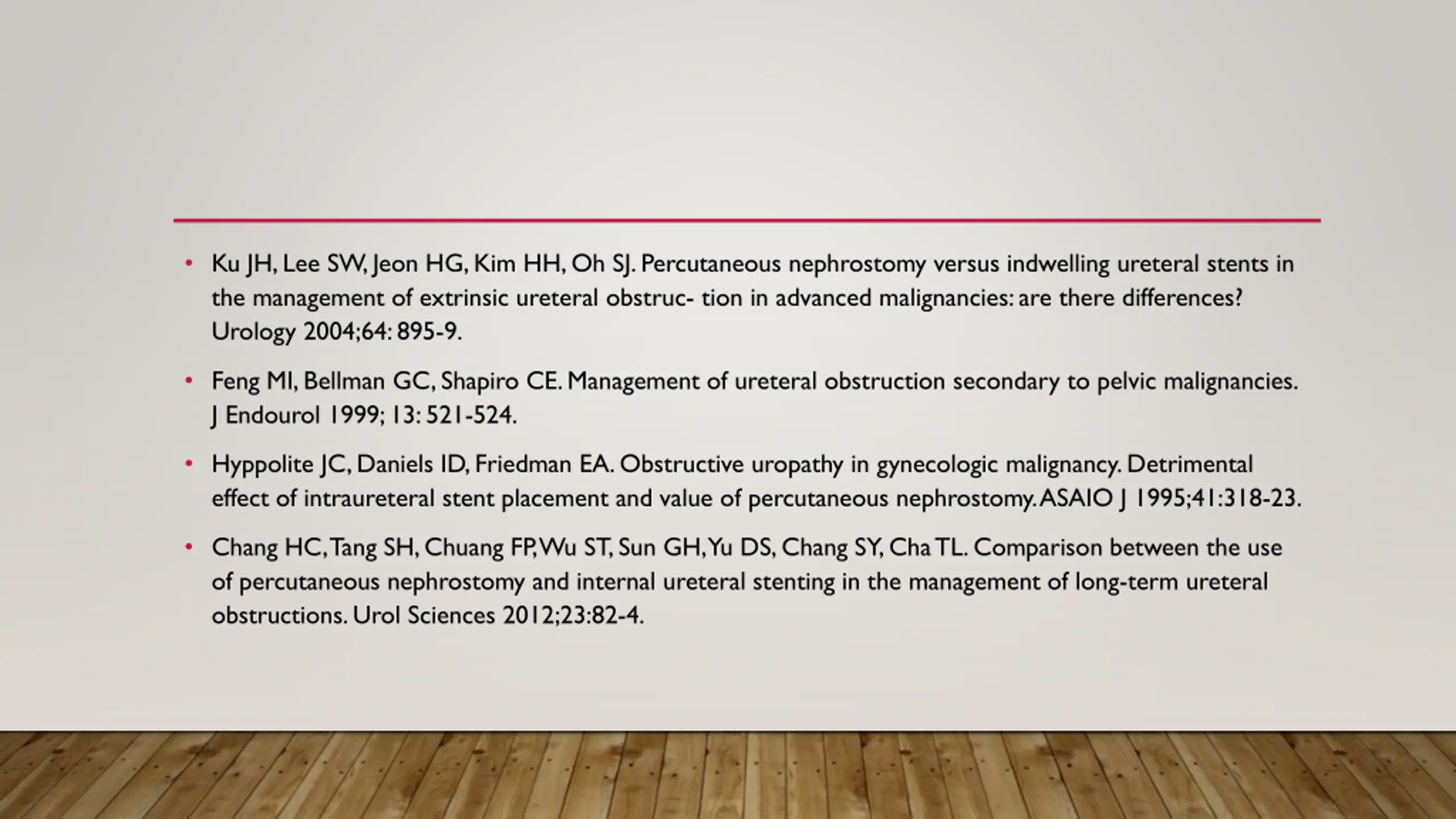 Ku JH, Lee SW, Jeon HG, Kim HH, Oh SJ. Percutaneous nephrostomy versus indwelling ureteral stents in the management of extrinsic ureteral obstruc- tion in advanced malignancies: are there differences? Urology 2004;64: 895-9. Feng MI, Bellman GC, Shapiro CE. Management of ureteral obstruction secondary to pelvic malignancies. J Endourol 1999; 13: 521-524. Hyppolite JC, Daniels ID, Friedman EA. Obstructive uropathy in gynecologic malignancy. Detrimental effect of intraureteral stent placement and value of percutaneous nephrostomy. ASAIO J 1995;41:318-23. Chang HC, Tang SH, Chuang FP, Wu ST, Sun GH, Yu DS, Chang SY, Cha TL. Comparison between the use of percutaneous nephrostomy and internal ureteral stenting in the management of long-term ureteral obstructions. Urol Sciences 2012;23:82-4.